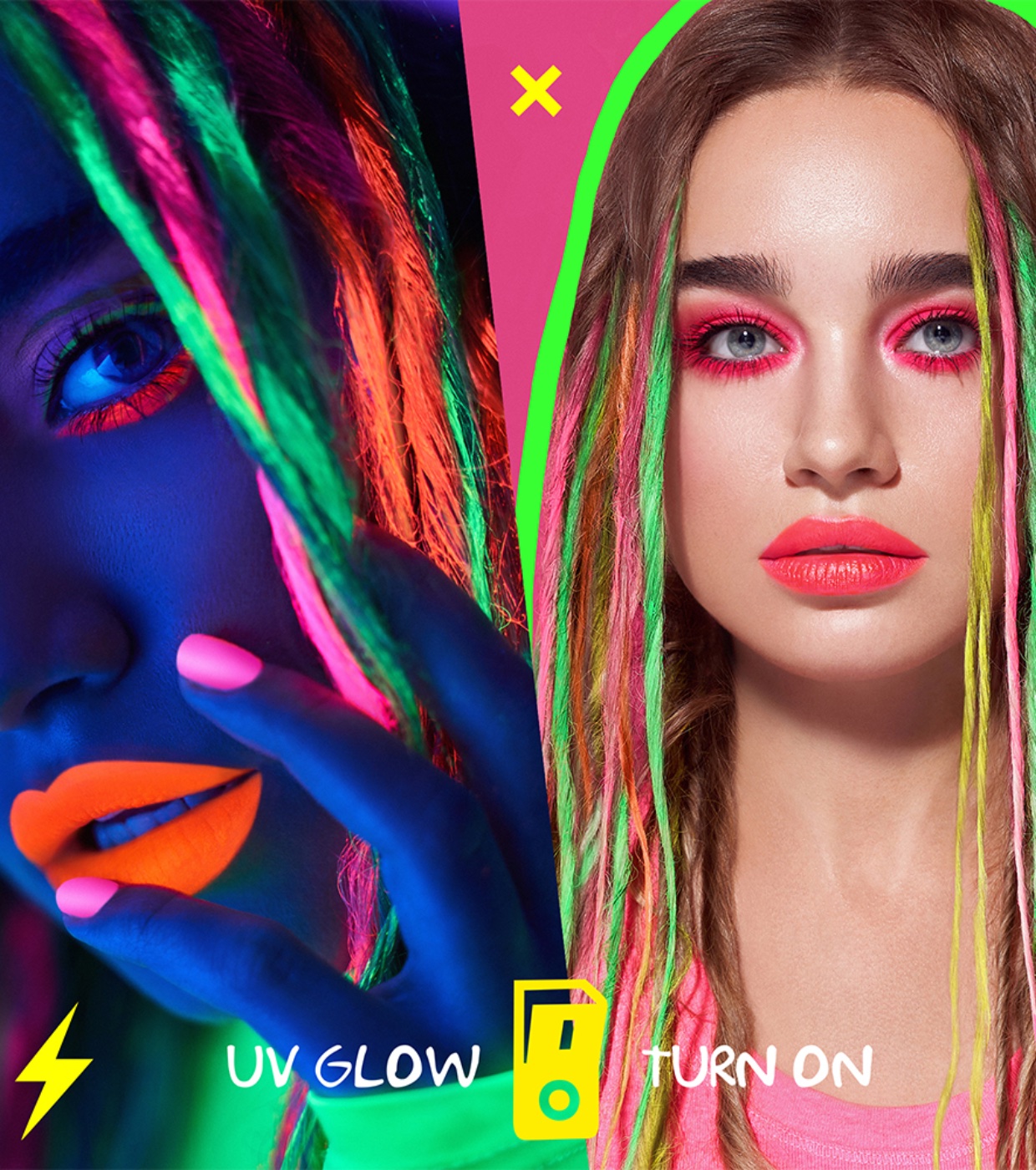 Este incríble tinte temporal hará que tu pelo sea de neón: brillará bajo la luz ultravioleta y, como los hilos mágicos de una telaraña mágica, atraerán continuas miradas de admiración.