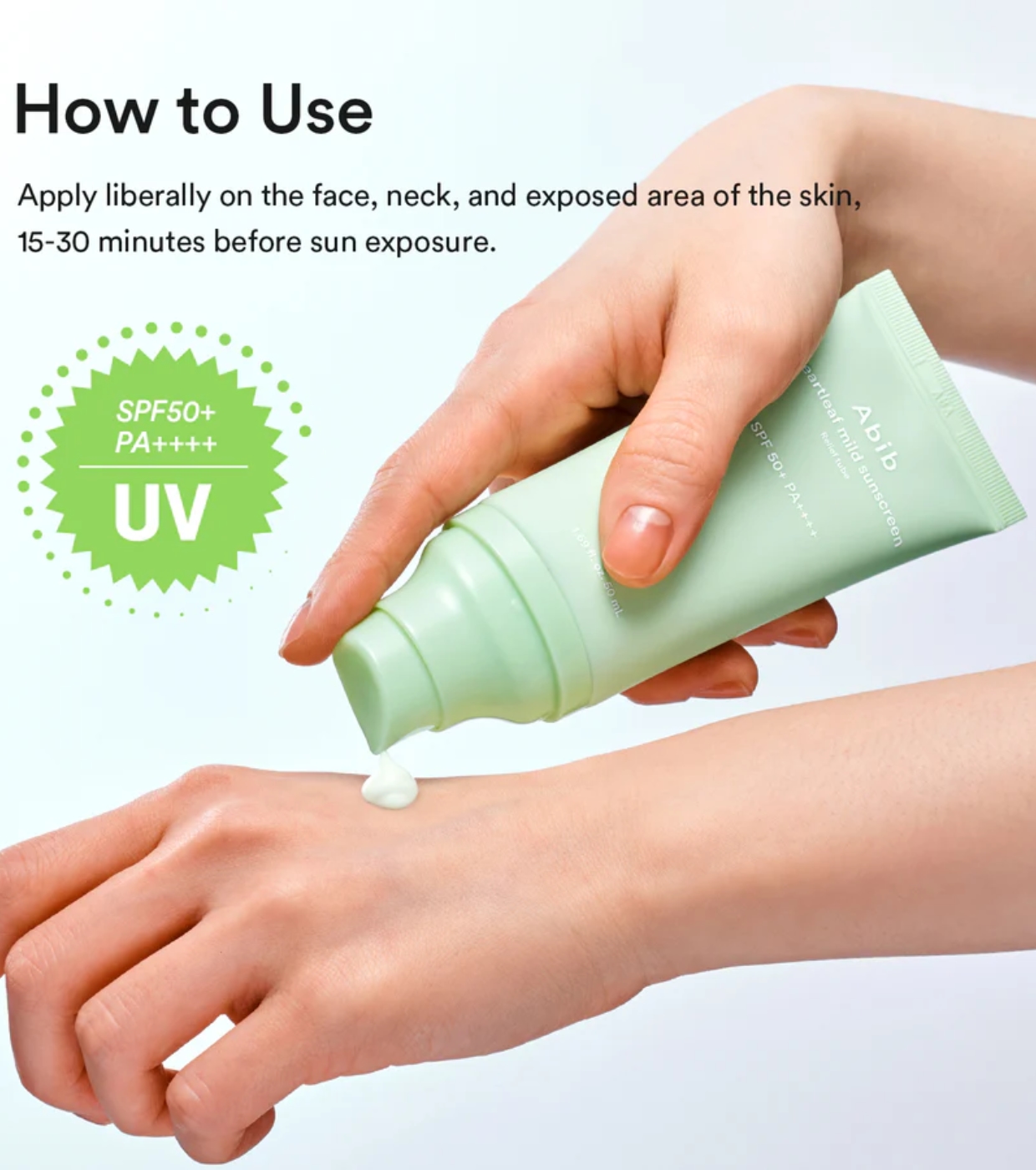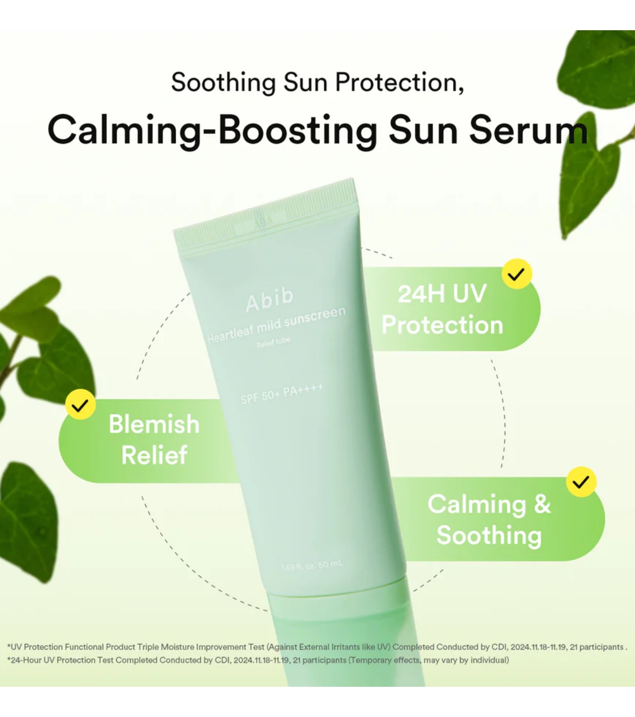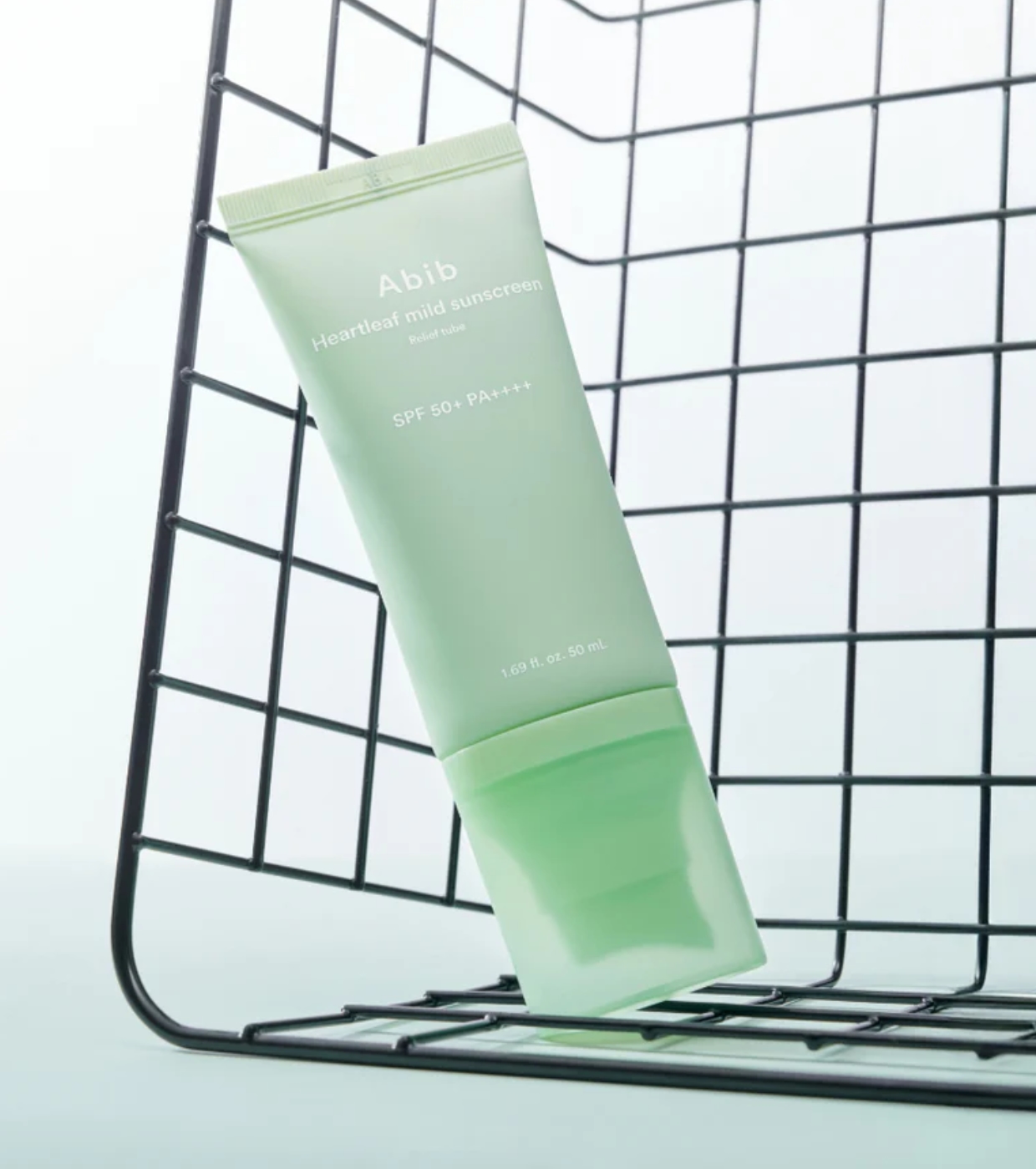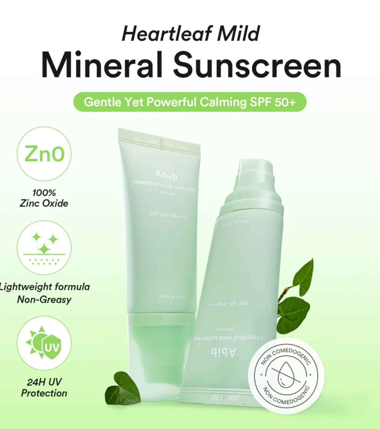 El protector solar mineral Heartleaf Mild SPF50+ PA++++ de Abib de amplio espectro especialmente formulado para pieles sensibles o con rojeces.