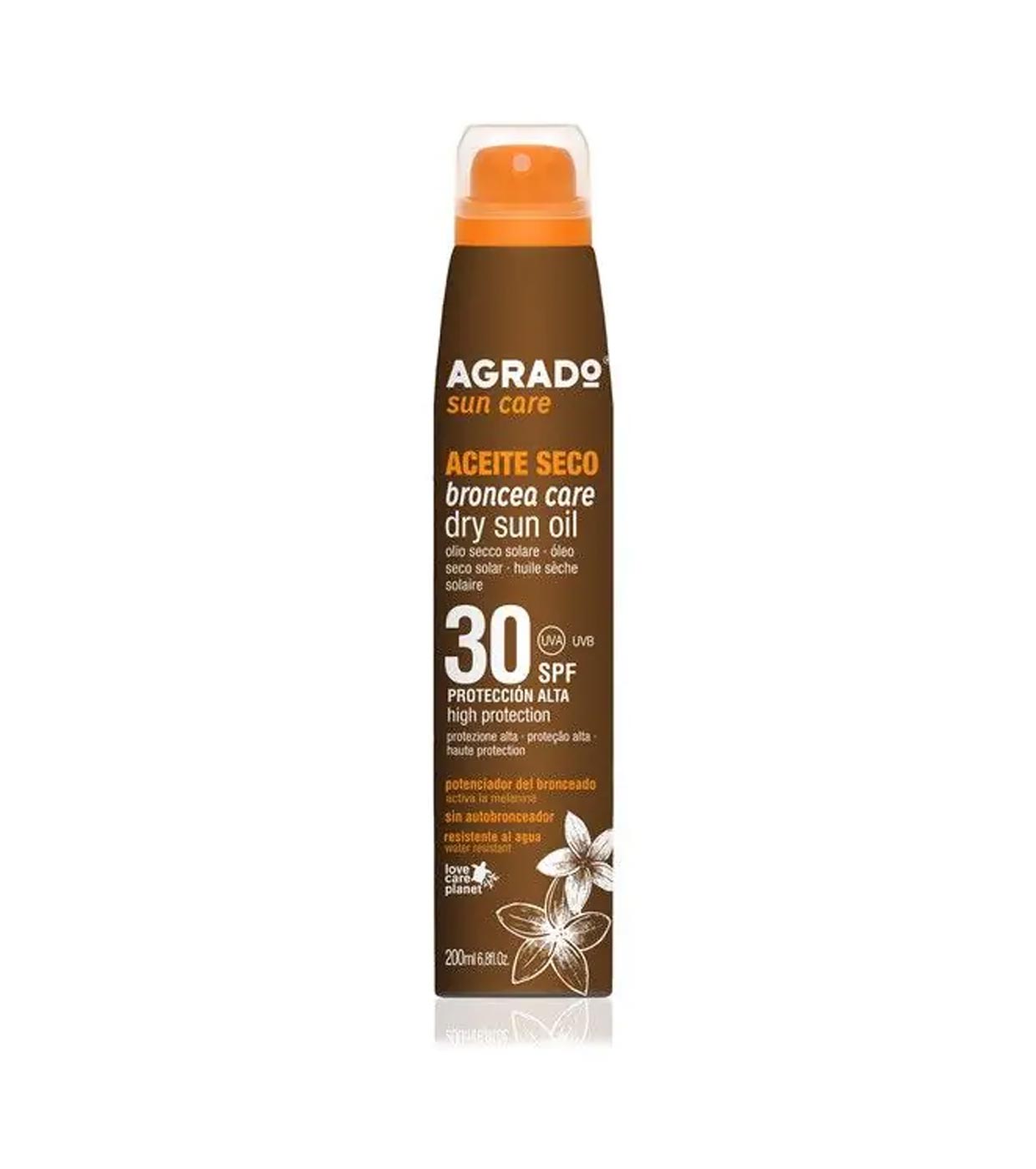 Aceite seco en bruma potenciador del bronceado SPF30 de Agrado.