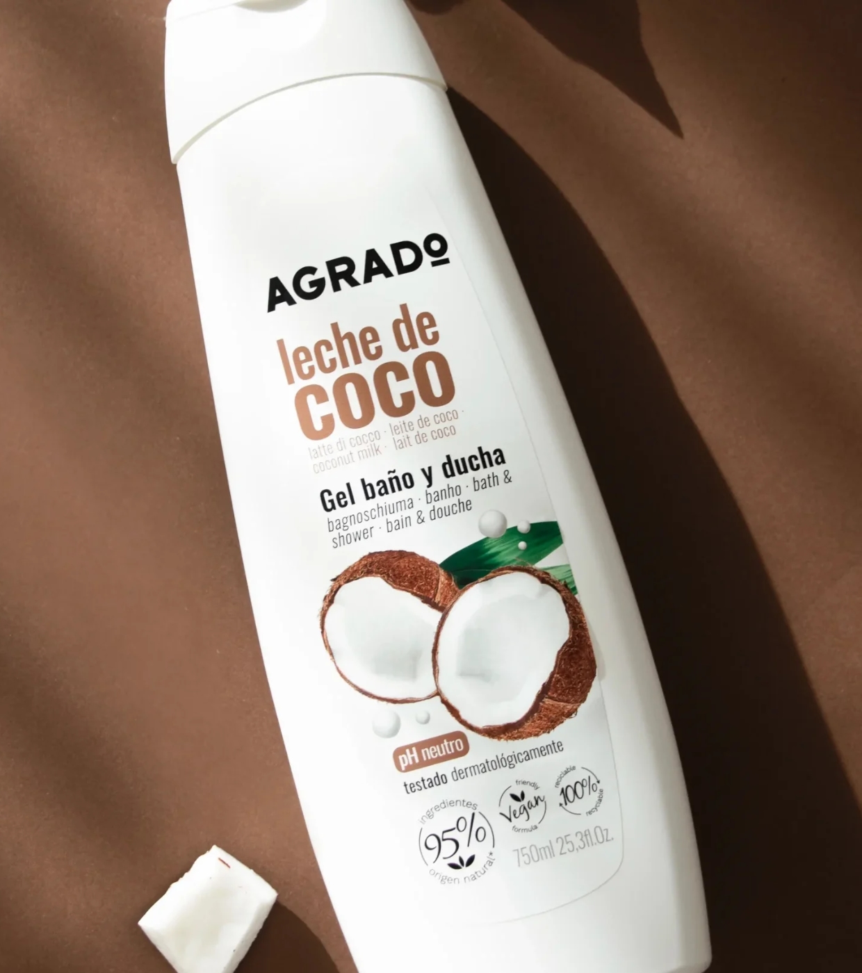 Gel de baño y ducha de leche de coco de Agrado Cosmetic está formulado para cuidar, limpiar y suavizar la piel.