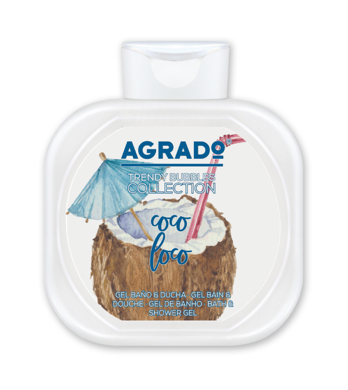 El gel de baño y ducha Coco Loco de la colección Trendy Bubbles de Agrado Cosmetics es ideal para dar un olor exótico, tropical y fresco a tus duchas o baños.