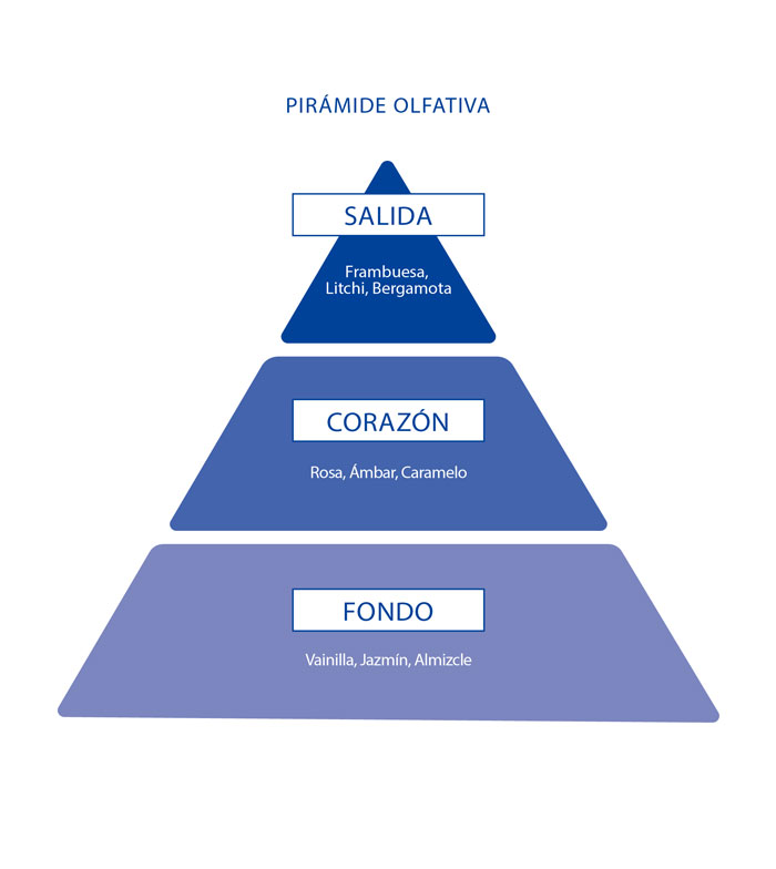 Sus notas de salida tienen matices de frutos rojos como la frambuesa y un toque de bergamota, que se funden en un corazón de notas de rosa, ámbar y caramelo, adquiriendo persistencia de forma paulatina un fondo con notas de vainilla, jazmín y almizcle.