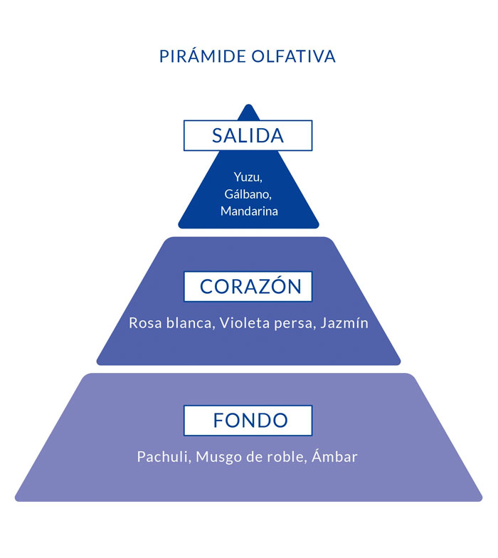 Dispone de un eau de toilette de fragancia viva y fresca, cuyo olor se caracteriza por mezclar pétalos de rosas blancas y jazmín junto a notas ozónicas y herbáceas. Que también se unen a la mandarina, violeta persa y el musgo de roble.