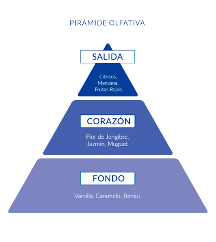 Dispone de un eau de toilette de fragancia floral y frutal, donde se combinan deliciosos olores como a frambuesa dulce y cítricos acentuados con suaves notas de jengibre, jazmín y vainilla.