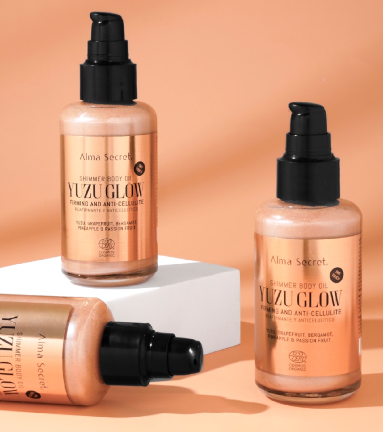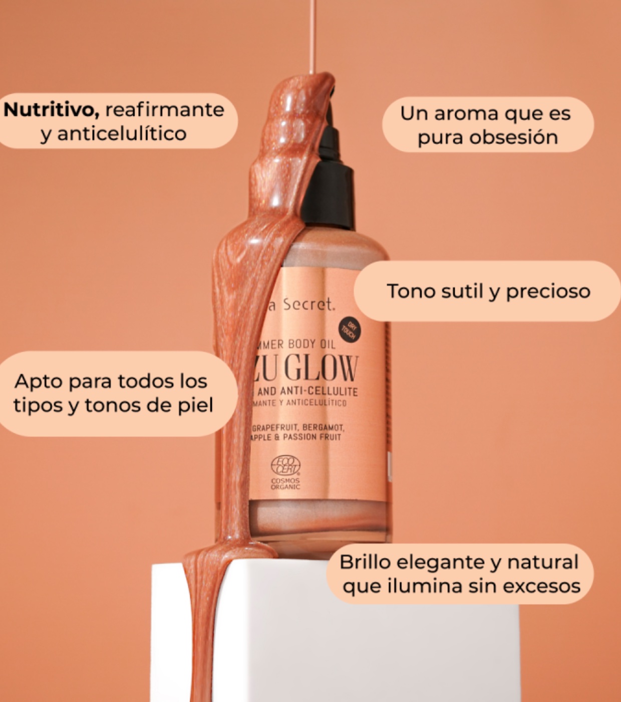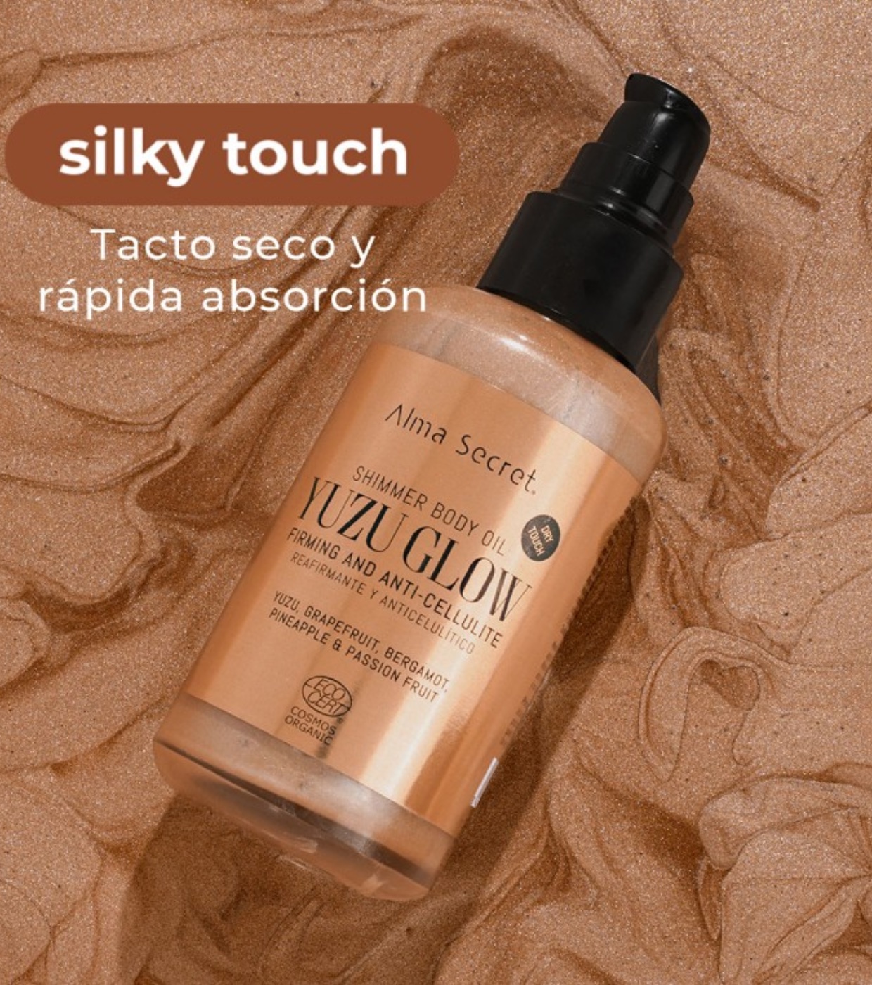 Consigue una piel radiante y sexy con este lujoso aceite iluminador de tacto seco y acabado sedoso “Silky Touch”, que además trabaja para mejorar la elasticidad, reafirmar, combatir celulitis, estrías y flacidez.