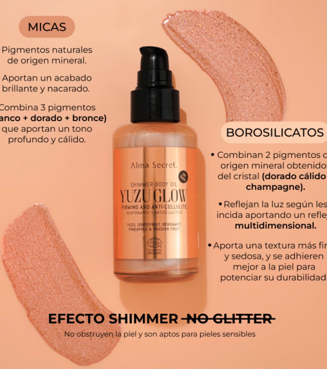 Aporta destellos sutiles, con tamaños de partícula pequeña y luminosidad que mantengan la elegancia de la piel.