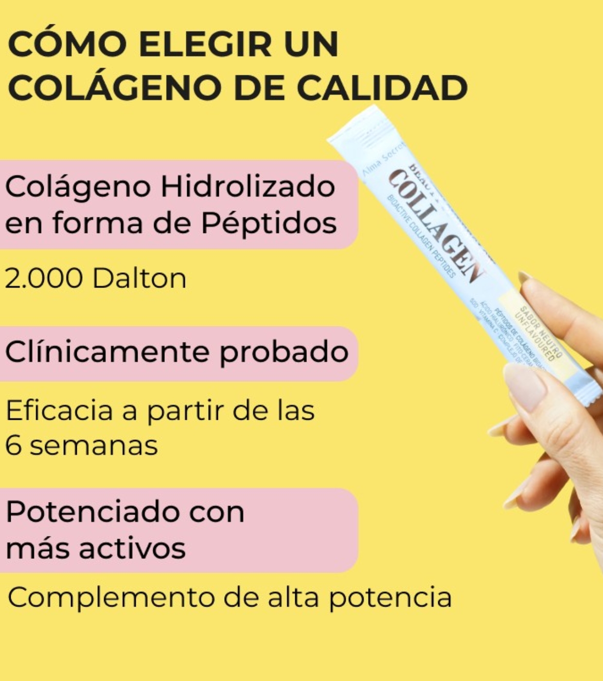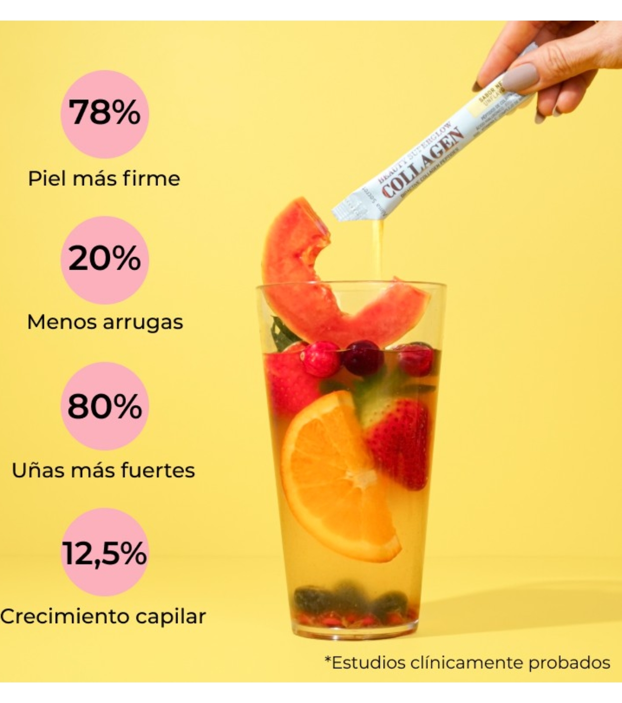 Cada sobre contiene 2,5 g de Péptidos de Colágeno Bioactivos de alta potencia y bajo peso molecular (2.000 dalton) para una absorción óptima.