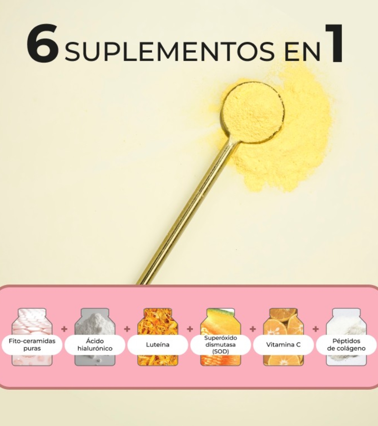 Colágeno bovino hidrolizado 2500mg, Extracto de Acerola (Malpighia glabra L.) 320mg, Espesante: Dextrina, Antiaglomerante: dióxido de silicio, Extracto de Caléndula (Calendula offcinalis L.) 220mg, Ácido Hialurónico 150mg, Edulcorante: Eritritol 120mg, Aroma Natural, Extracto de Trigo (Triticum vulgare L.) 30mg, Extracto de Romero (Rosmarinus offcinalis L.) 10mg, Extracto de Frutos Rojos 10mg: Pepita Uva (Vitis vinifera L.), Granada (Punica granatum L.) Arándano Azul (Vaccinium corymbosum L.), Fresa (Fragaria vesca L.), Arándano Rojo (Vaccinium macrocarpon Ait.), Frambuesa (Rubus idaeus L.), Mirtilo (Vaccinium myrtillus L.), Extracto de Melón (Cucumis melo L.) 4,8mg.