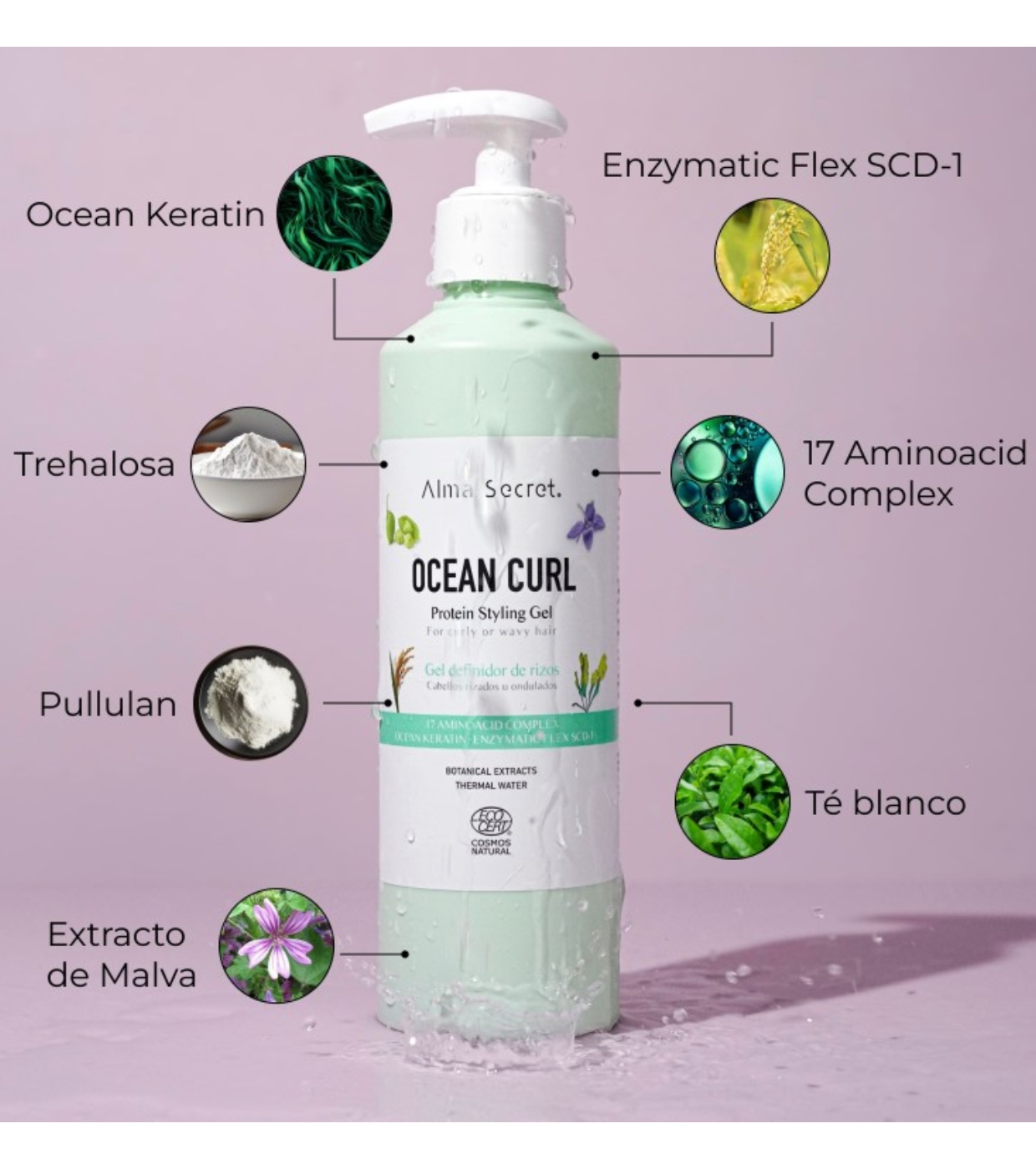 El Ocean Curl de Alma Secret es un gel activador y definidor de rizos de última generación que repara, hidrata y da forma al cabello rizado y ondulado, aportando elasticidad, volumen y movimiento natural sin rigidez ni apelmazamiento.