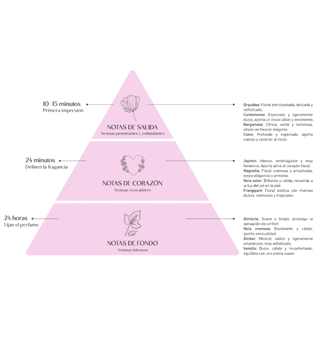 Su fragancia se abre con un toque cítrico y especiado que aporta frescura y vitalidad, seguido de un corazón floral y empolvado que evoca la suavidad de la luz natural.