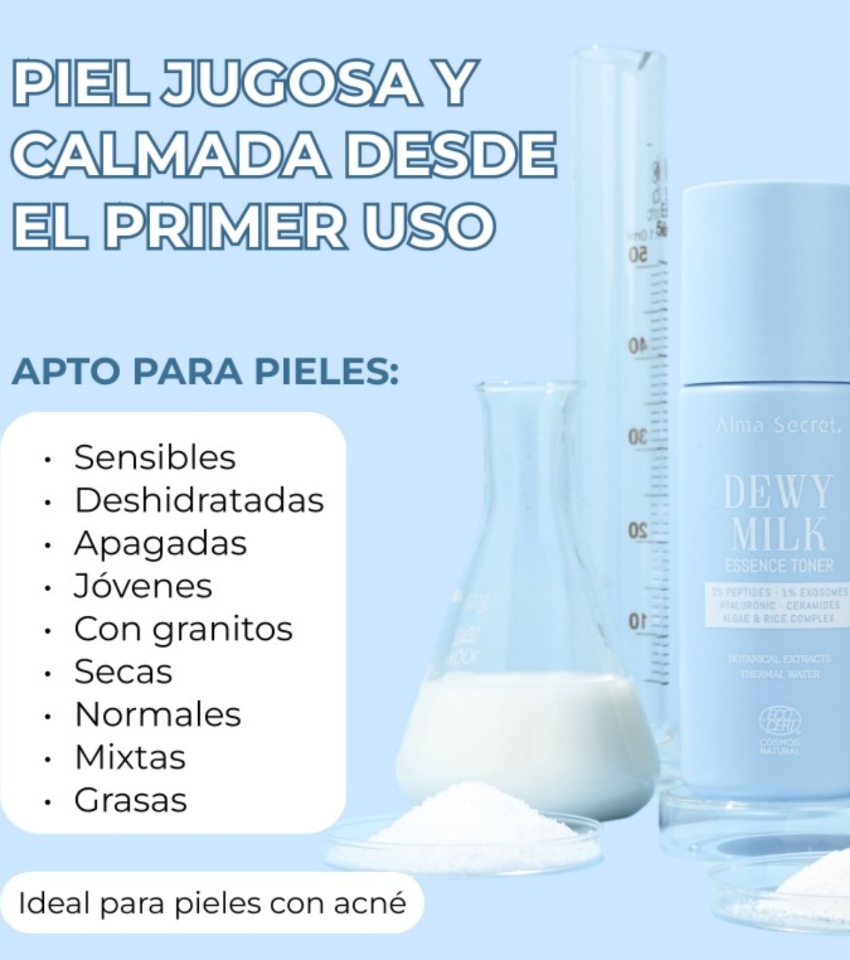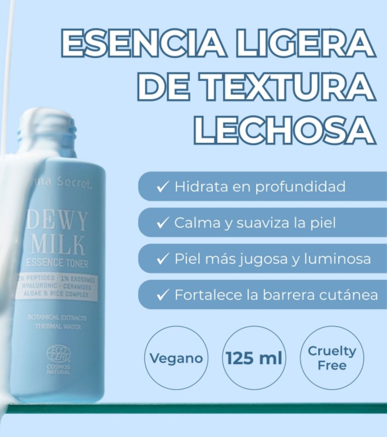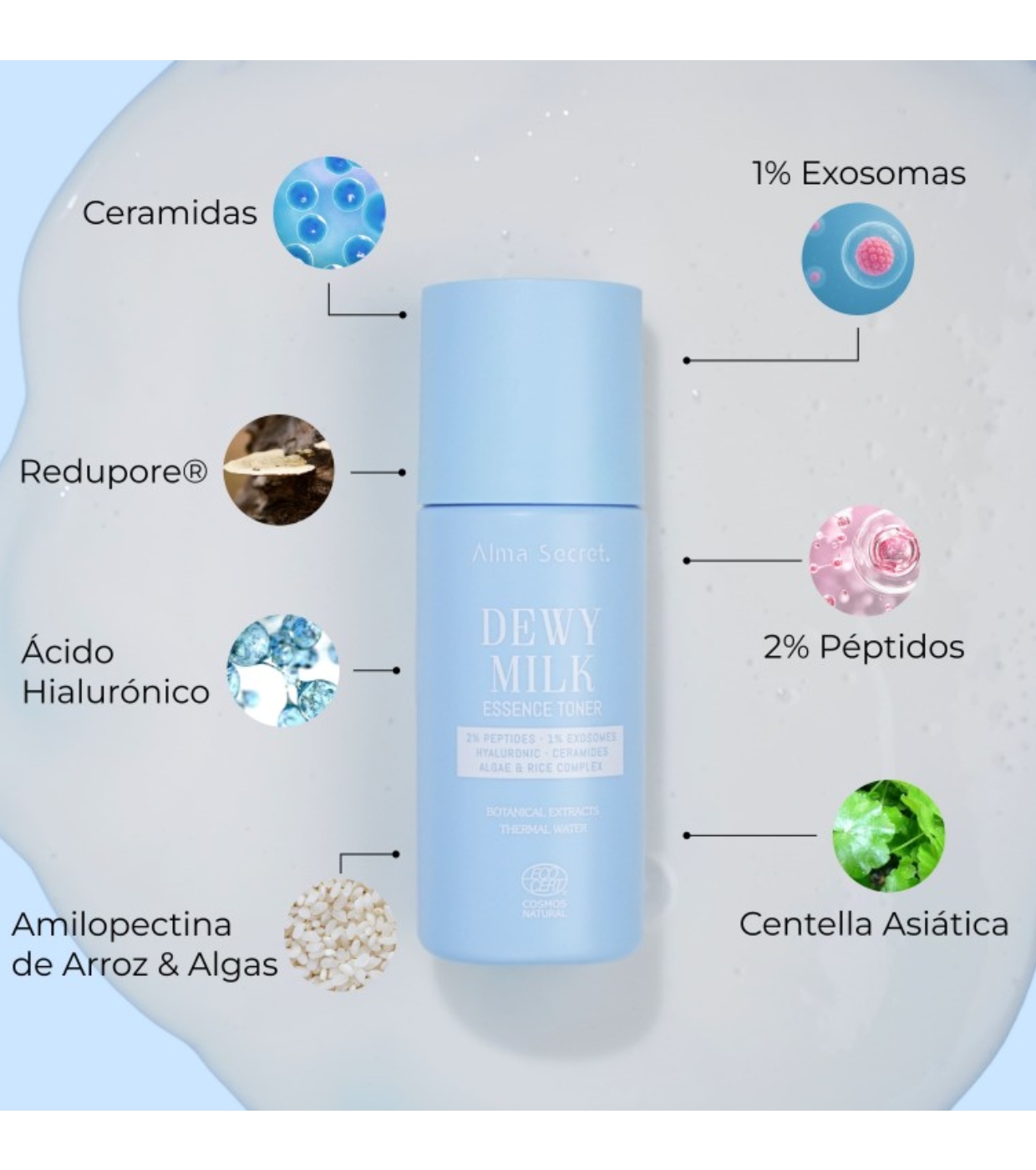 El Dewy Milk Essence Toner de Alma Secret es un tónico-esencia oil-free de textura lechosa y ligera, diseñado para hidratar en profundidad, calmar y suavizar la piel desde el primer uso.