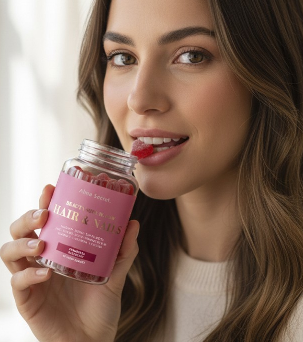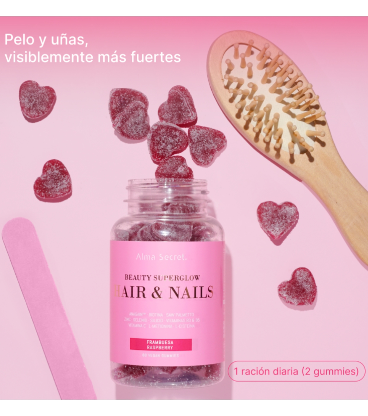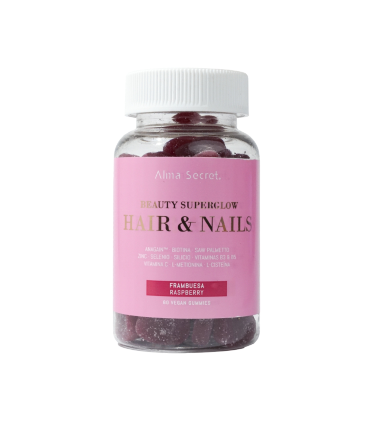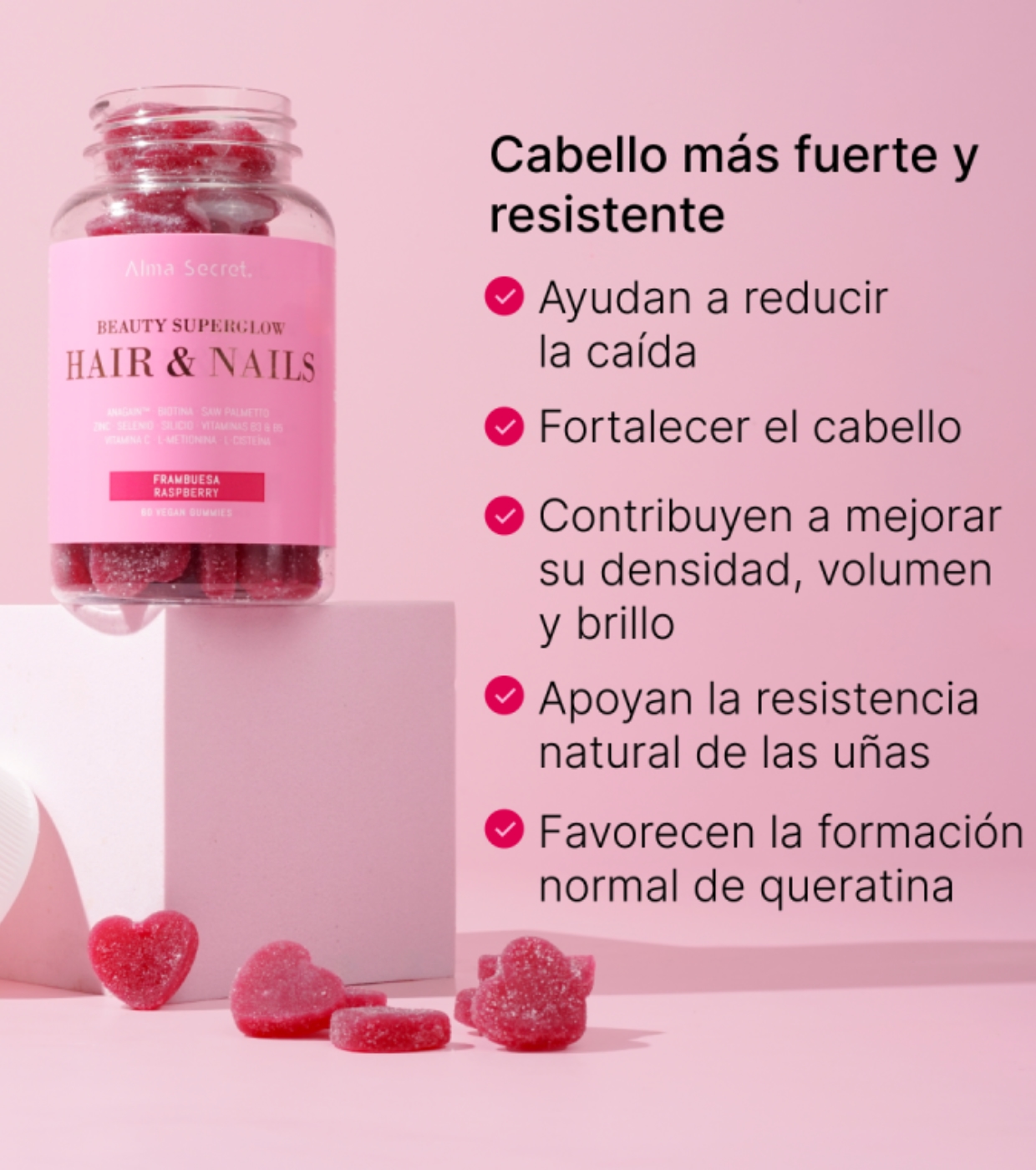 Consigue un cabello más fuerte y unas uñas más resistentes con estas gummies de Alma Secret formuladas con 11 activos naturales cuidadosamente seleccionados para actuar en sinergia.