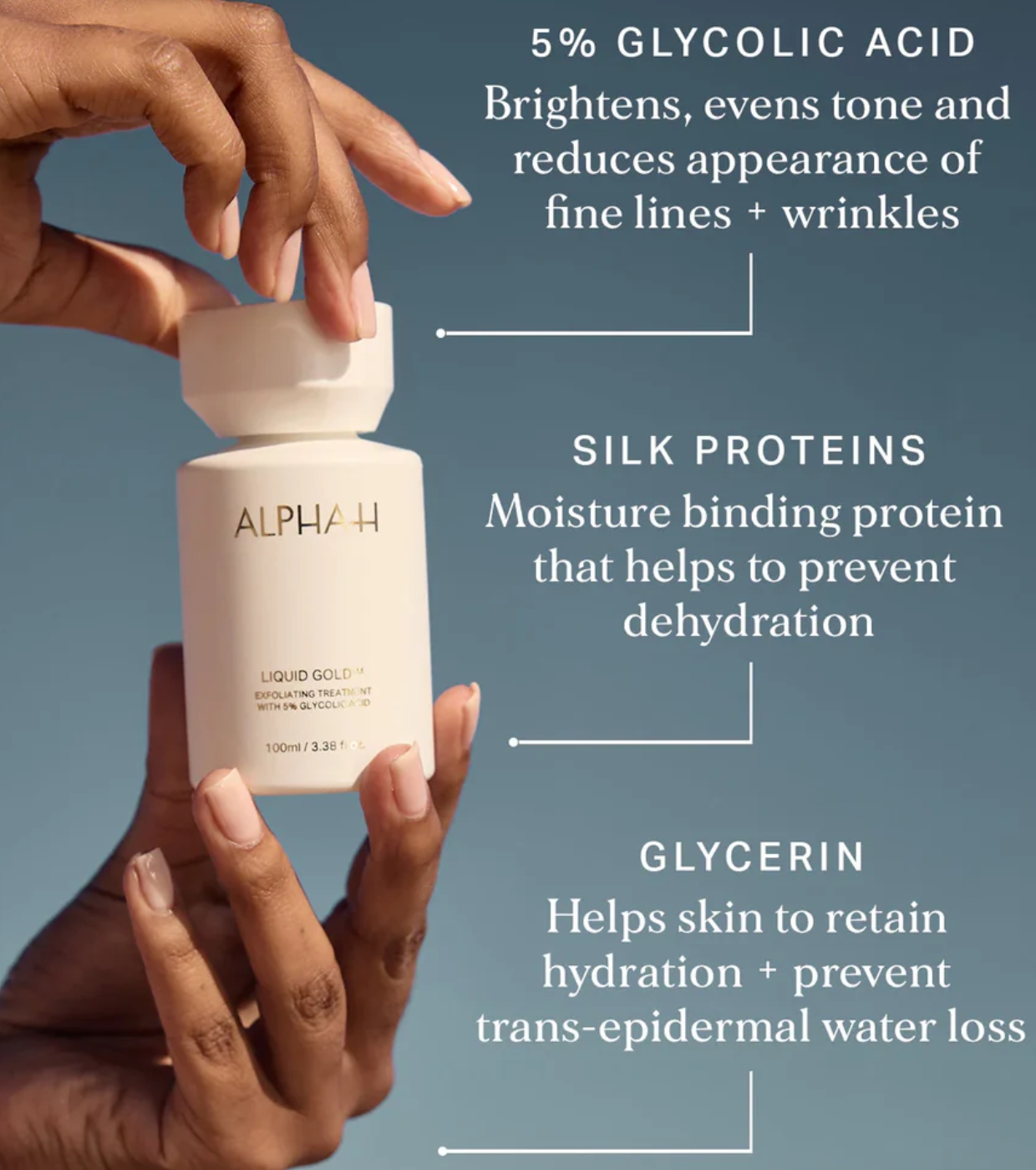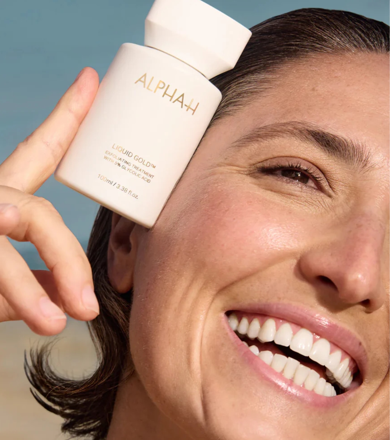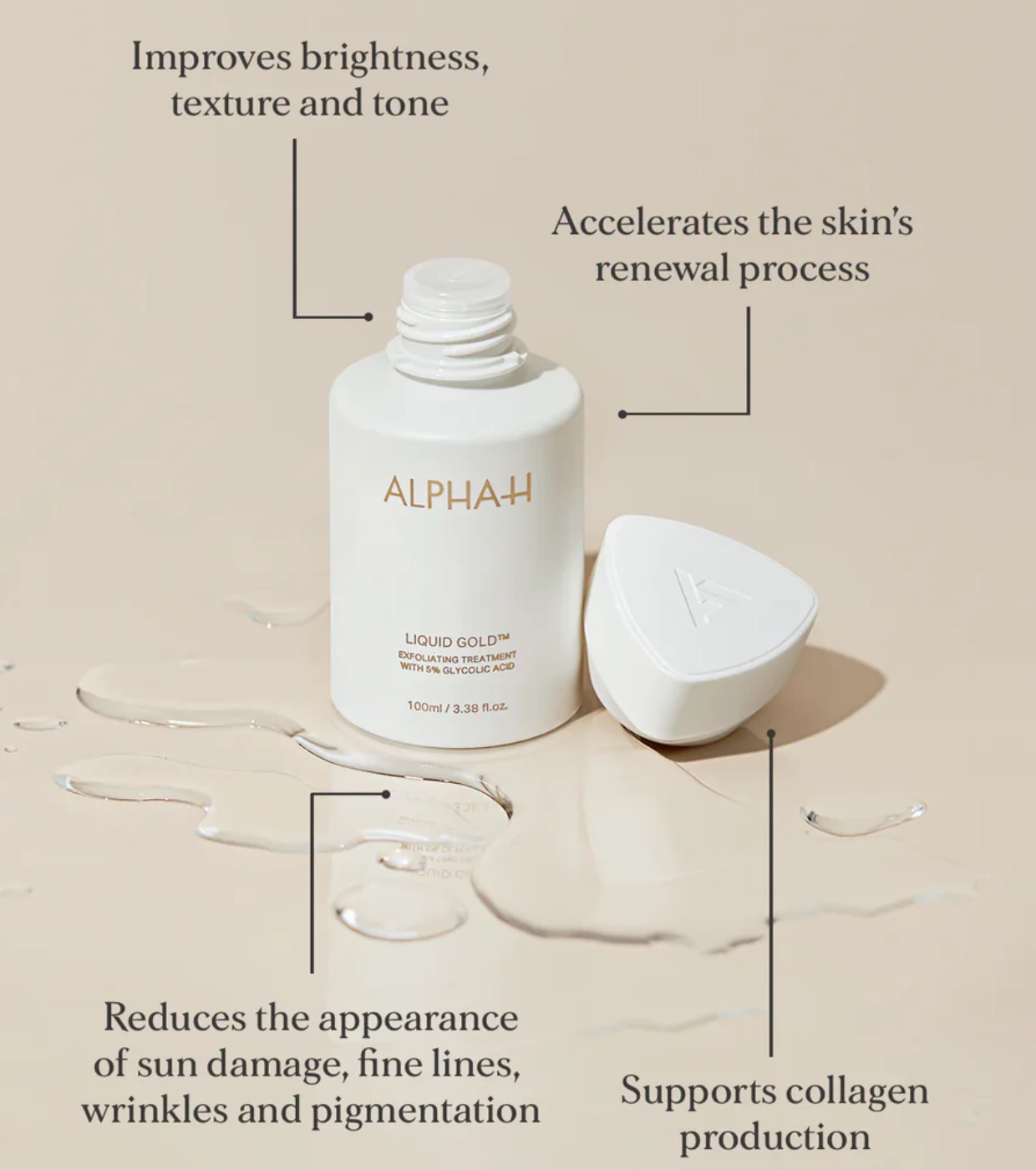 Liquid Gold de Alpha-H es un icónico tratamiento exfoliante nocturno formulado con 5 % de ácido glicólico (AHA) y un pH bajo (2,8–3,0) que favorece una exfoliación eficaz y de alta precisión.