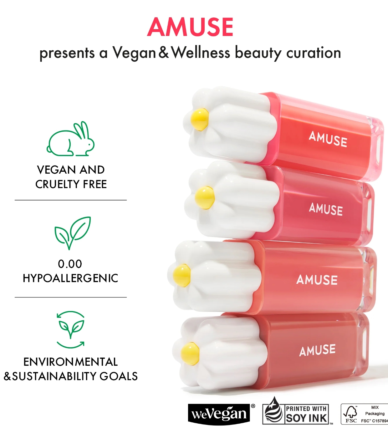 El Dew Tint de AMUSE es un tinte labial vegano de textura ligera y base acuosa que aporta un acabado jugoso, brillante y natural.