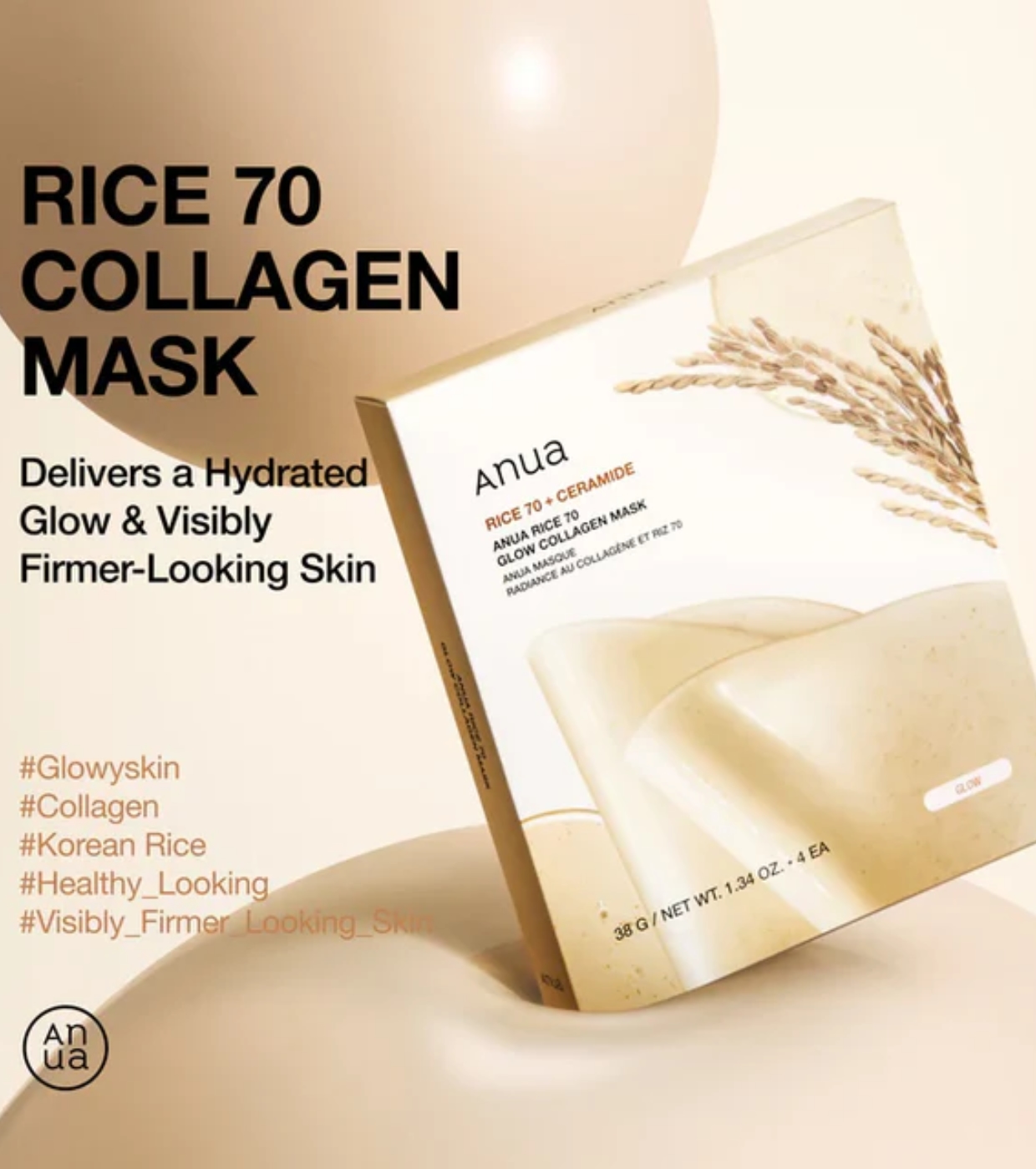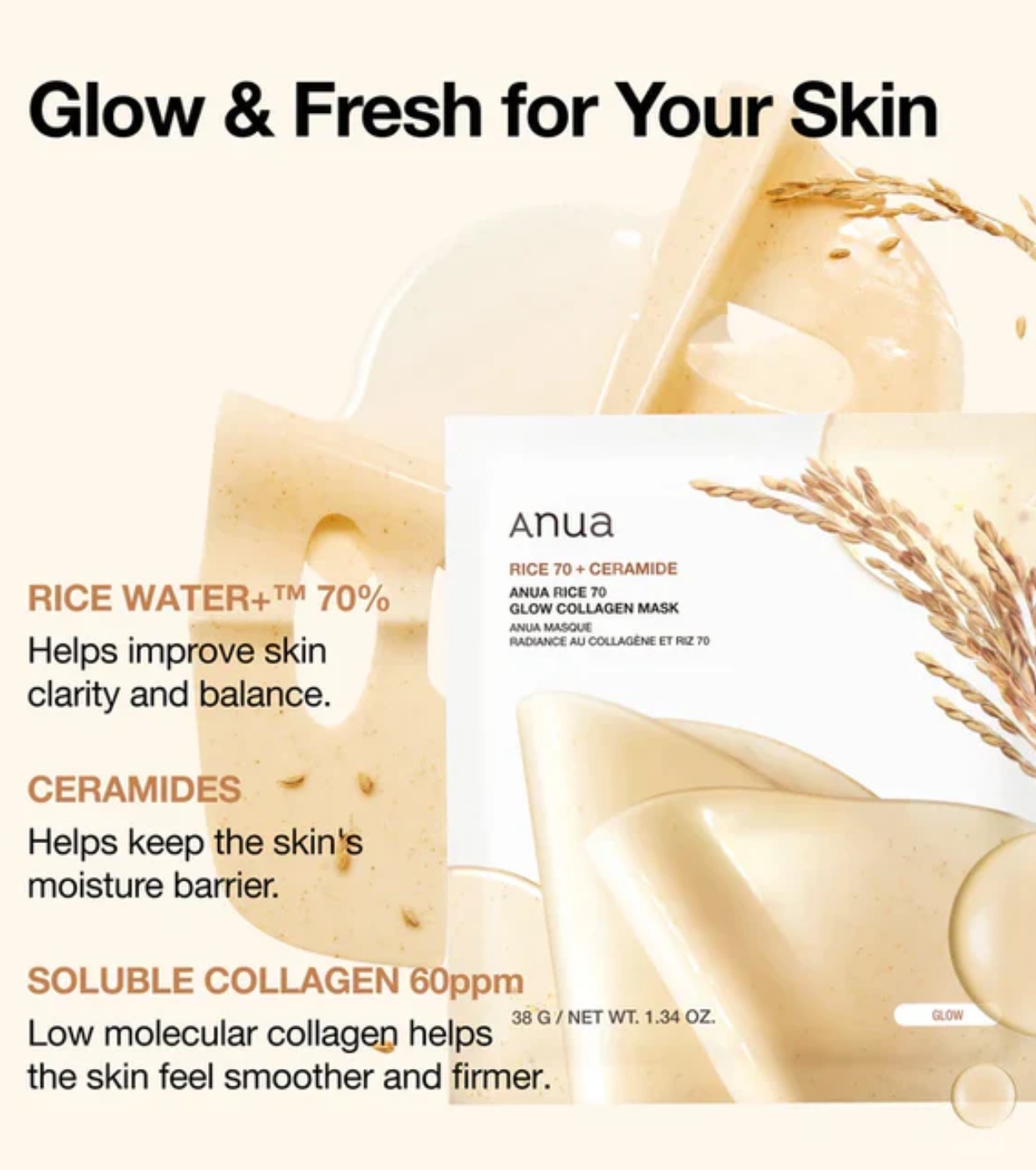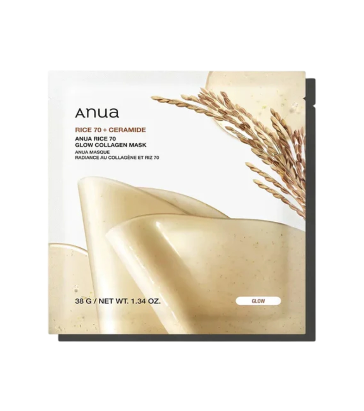 La Rice 70 Glow Collagen Mask de Anua es una mascarilla de hidrogel ultrafino (≈1 mm) formulada con 70 % de agua de arroz, colágeno de bajo peso molecular (300 Da) y ceramida NP, que trabaja para hidratar en profundidad, mejorar la elasticidad y reforzar la barrera cutánea.