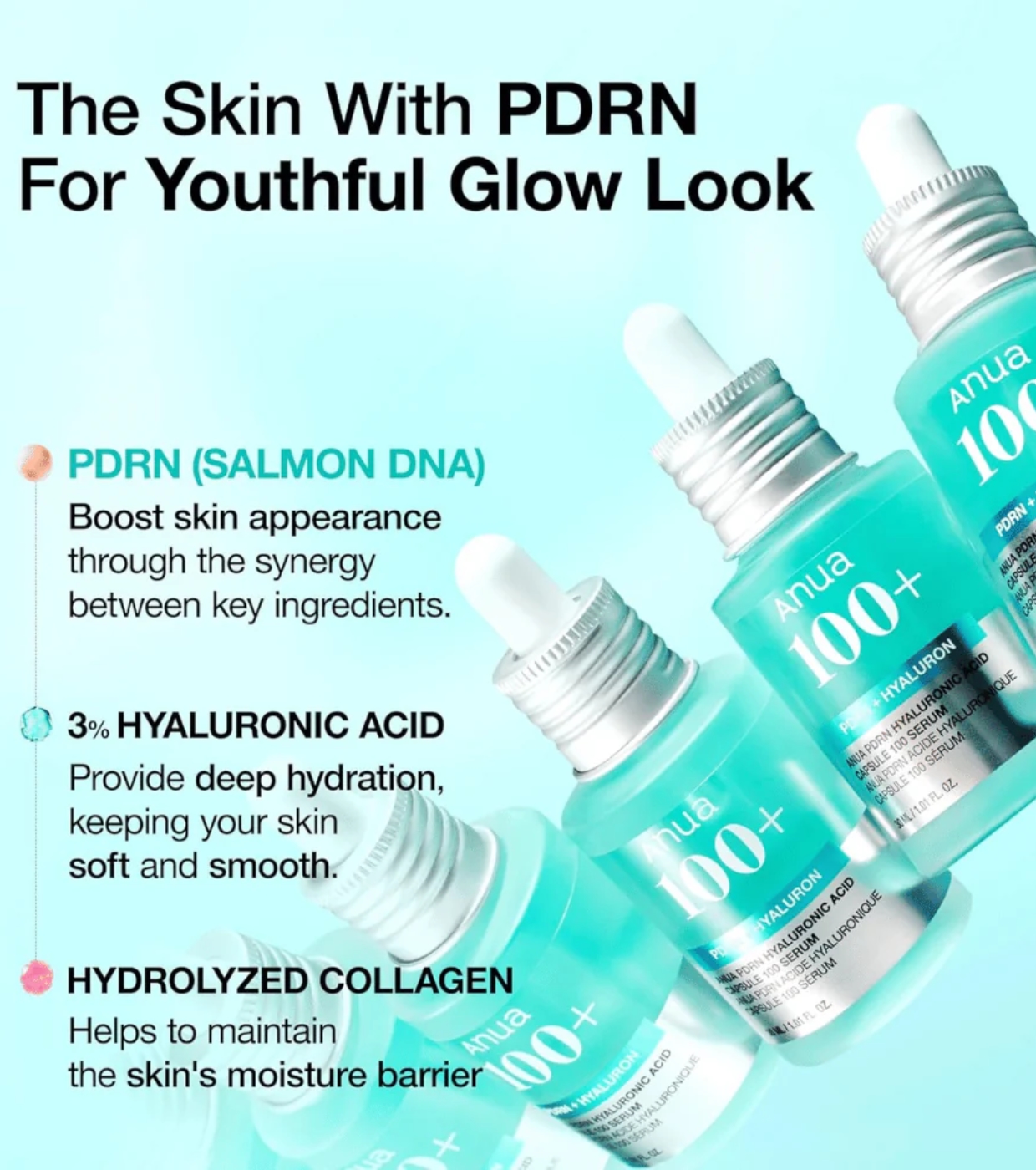 El sérum hidratante con ácido hialurónico PDRN Capsule 100 de Anua es un suero ultra hidratante y anti-envejecimiento que combina PDRN, colágeno y 11 tipos de ácido hialurónico para fortalecer la barrera de humedad de la piel, mejorar su firmeza y reducir líneas finas y arrugas.