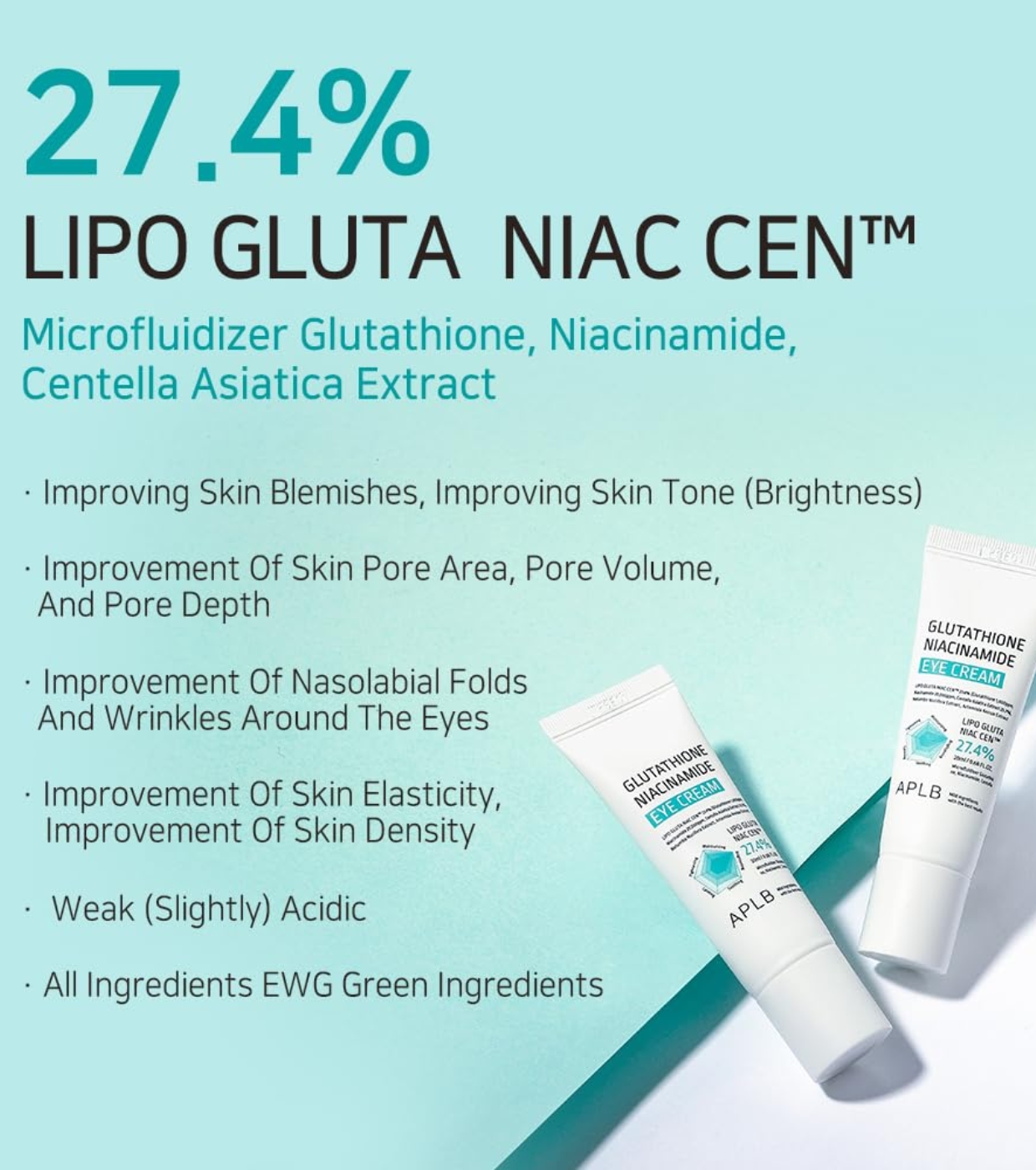 El Glutathione Niacinamide Eye Cream de APLB es una crema ligera para el contorno de ojos formulada para hidratar, iluminar y mejorar la elasticidad de la delicada piel del área ocular.