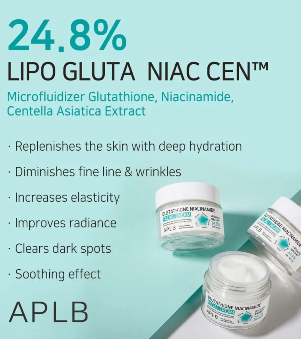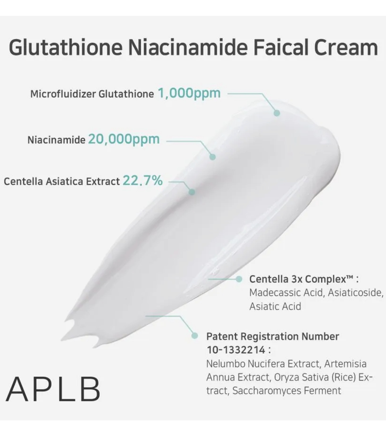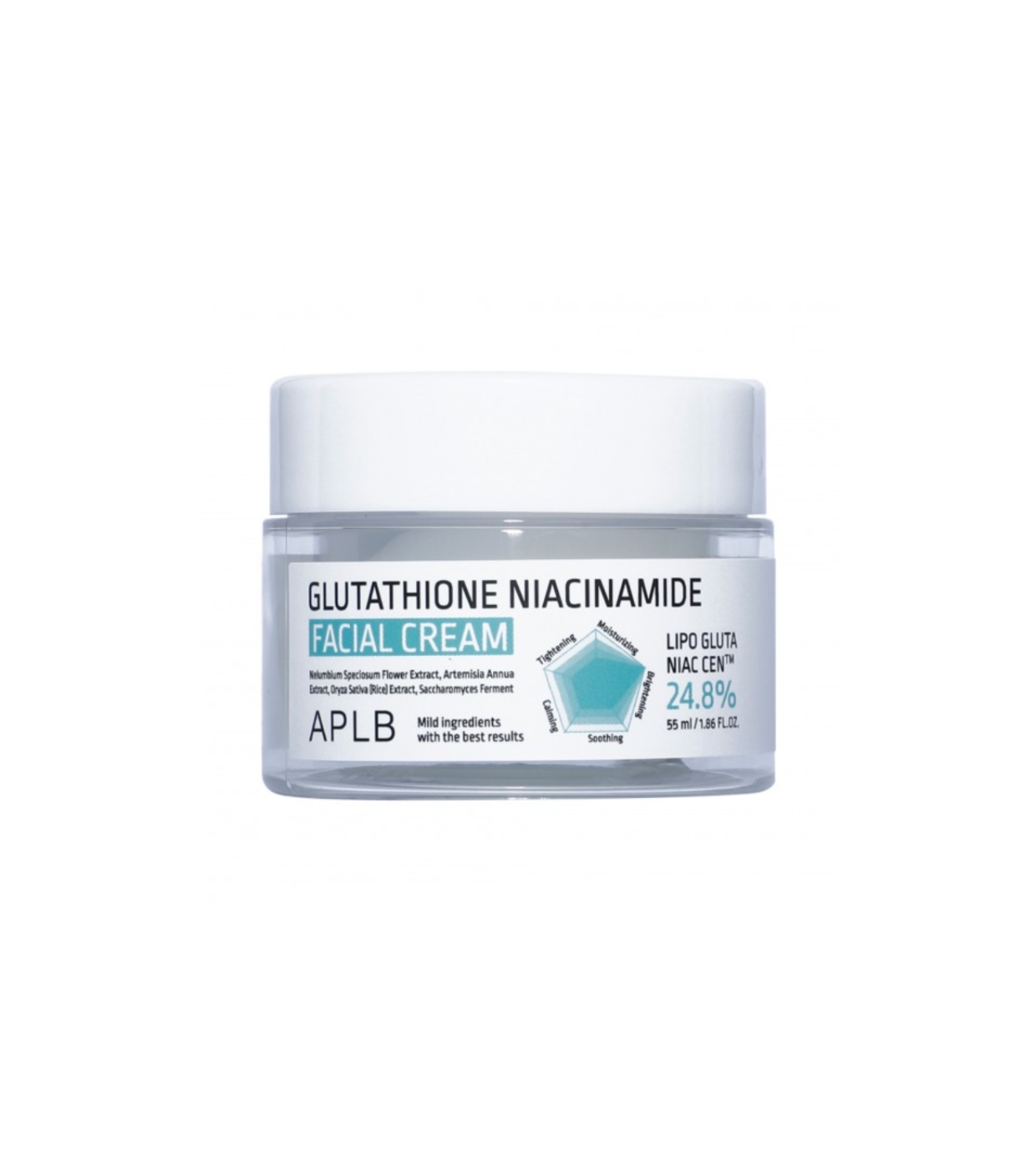 La Glutathione Niacinamide Facial Cream de APLB es una crema facial ligera y multifunción que hidrata, calma y mejora la luminosidad de la piel, aportando elasticidad, firmeza y un aspecto saludable.