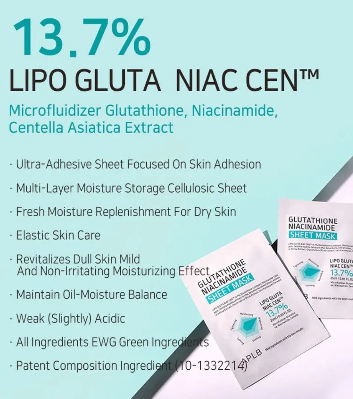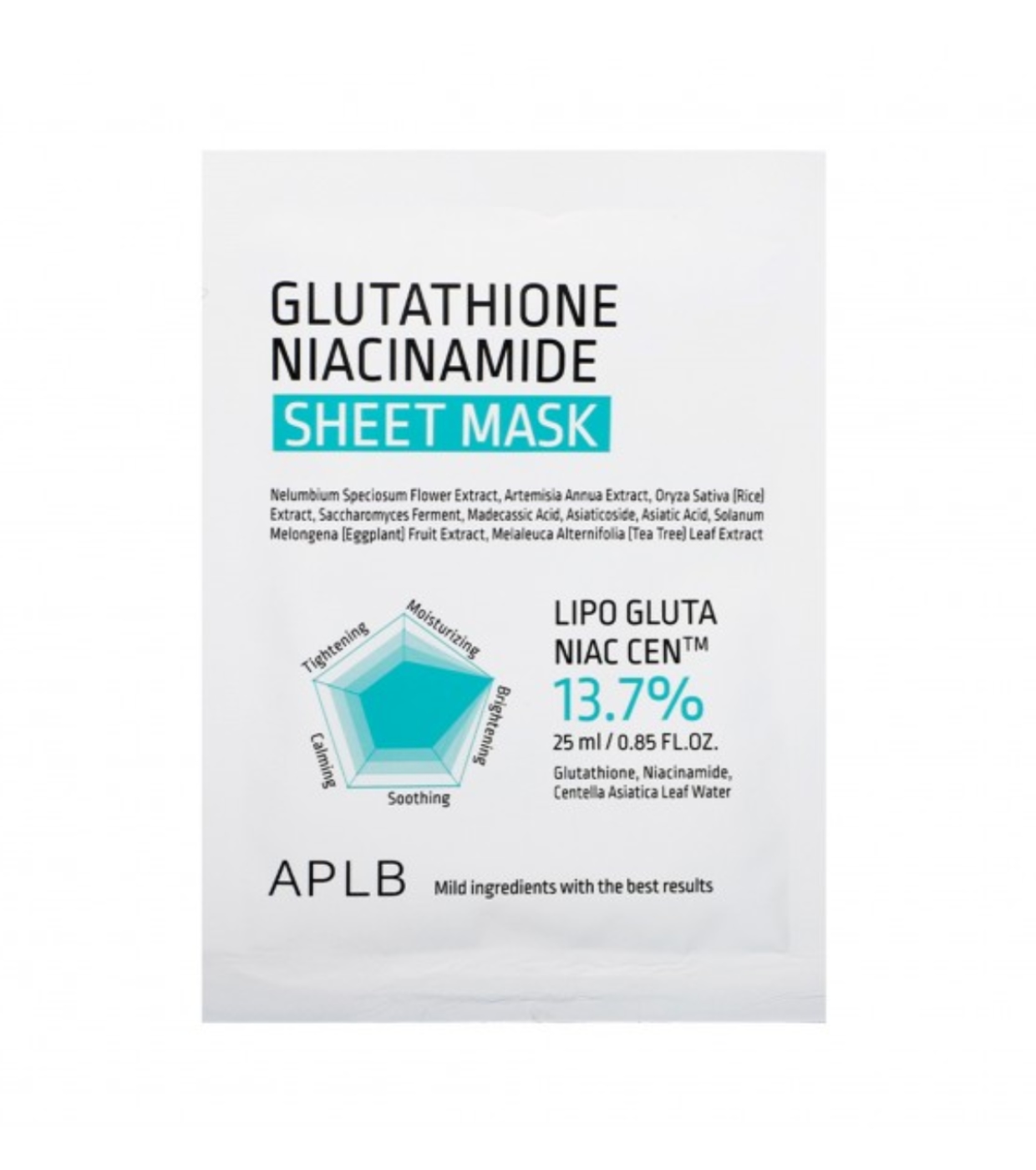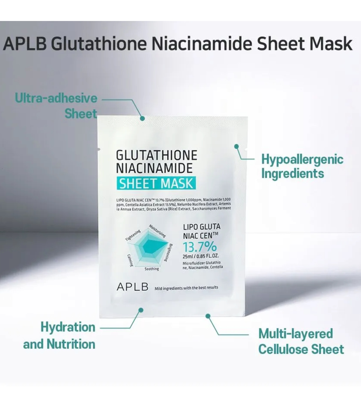 La Glutathione Niacinamide Sheet Mask de APLB es una mascarilla facial de tejido ultrafino diseñada para hidratar, calmar e iluminar la piel cansada, apagada o sensible.