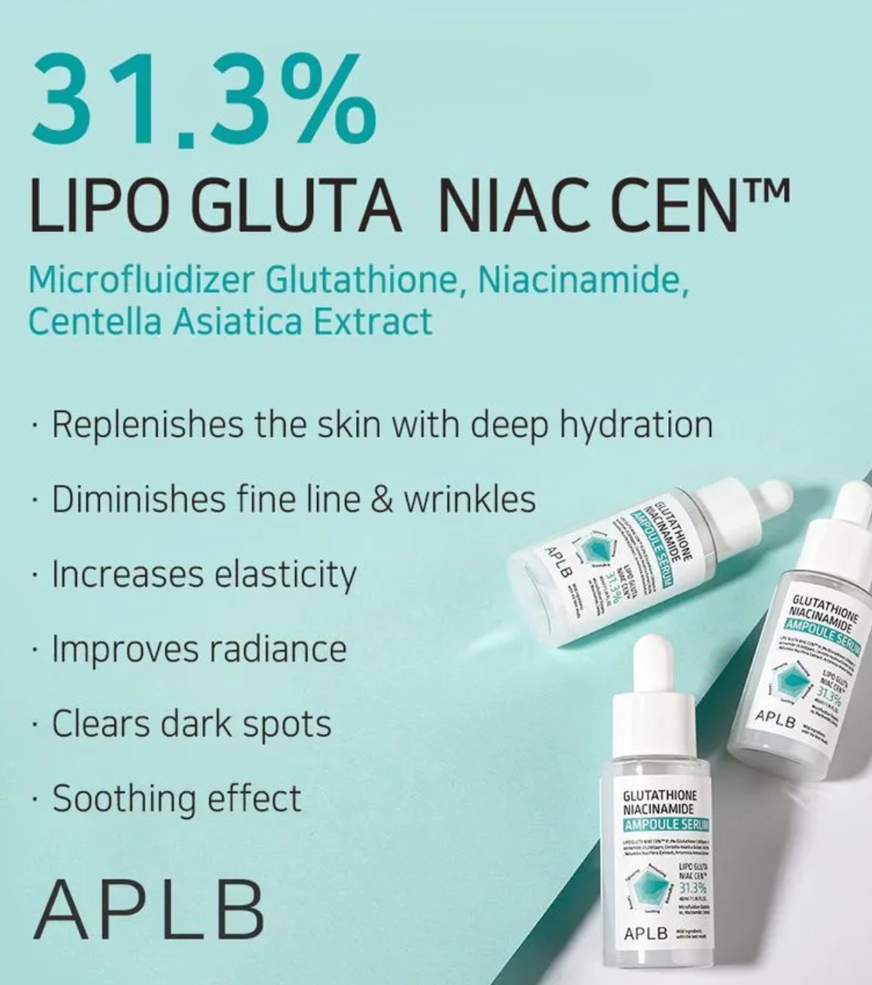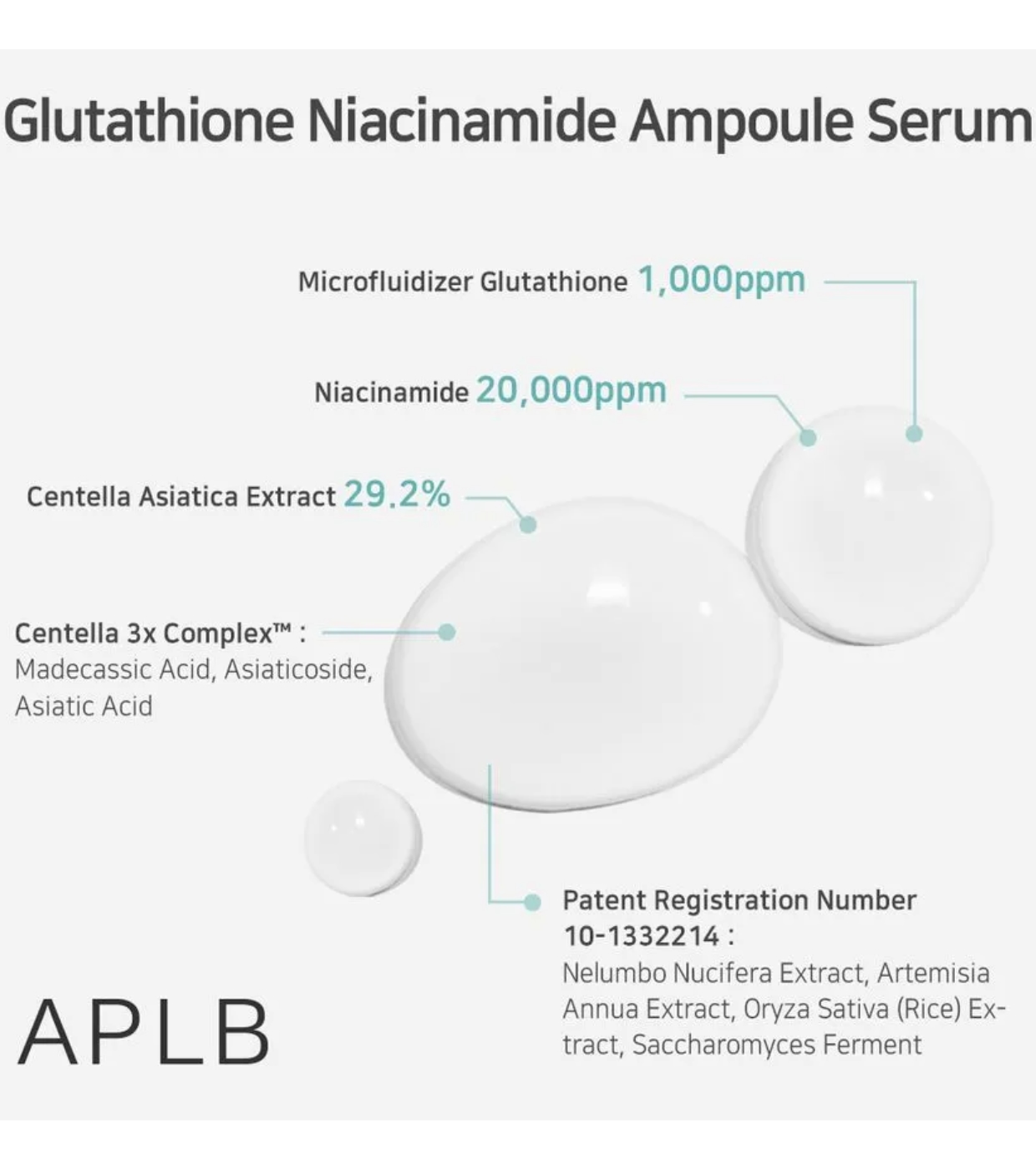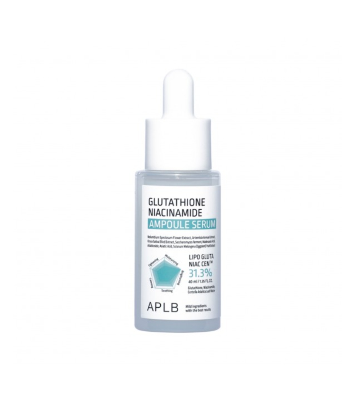 El Glutathione Niacinamide Ampoule Serum de APLB es un tratamiento facial iluminador diseñado para mejorar la uniformidad, luminosidad y vitalidad de la piel.