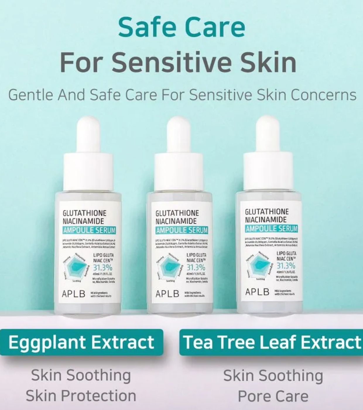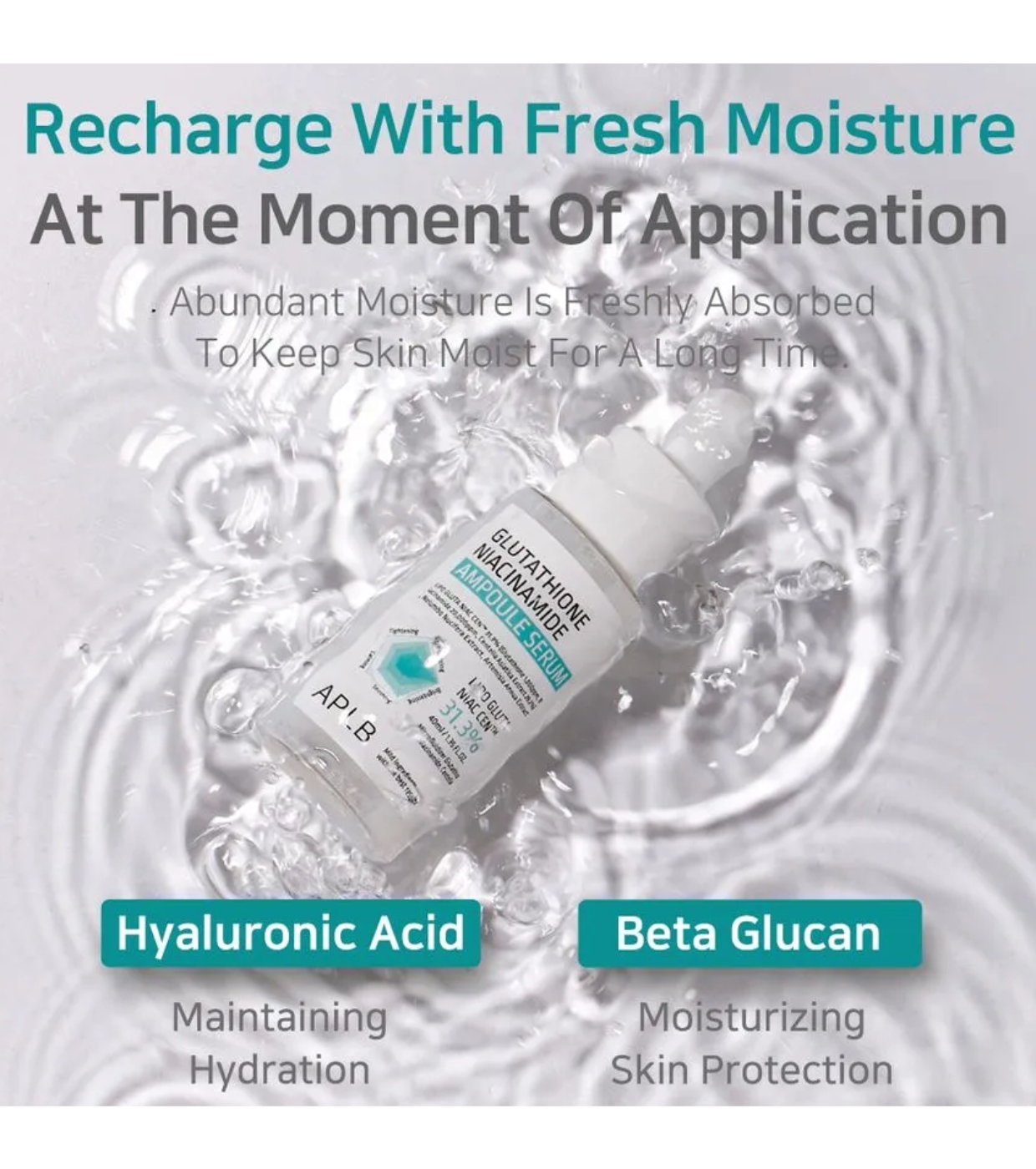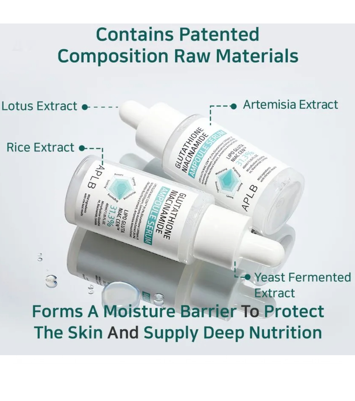 El Glutathione Niacinamide Ampoule Serum de APLB es un tratamiento facial iluminador diseñado para mejorar la uniformidad, luminosidad y vitalidad de la piel.