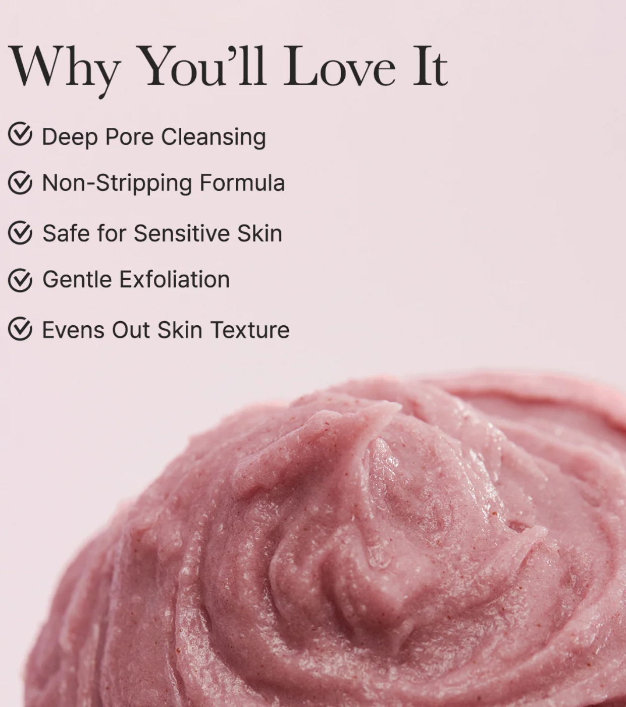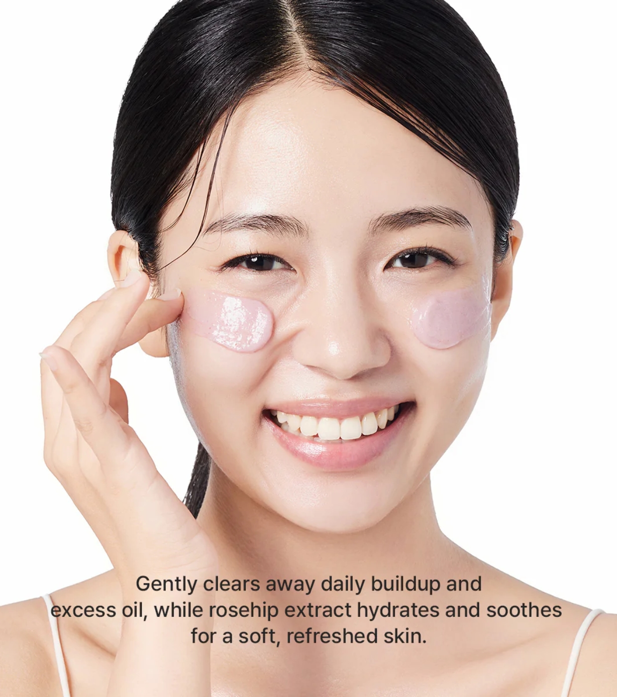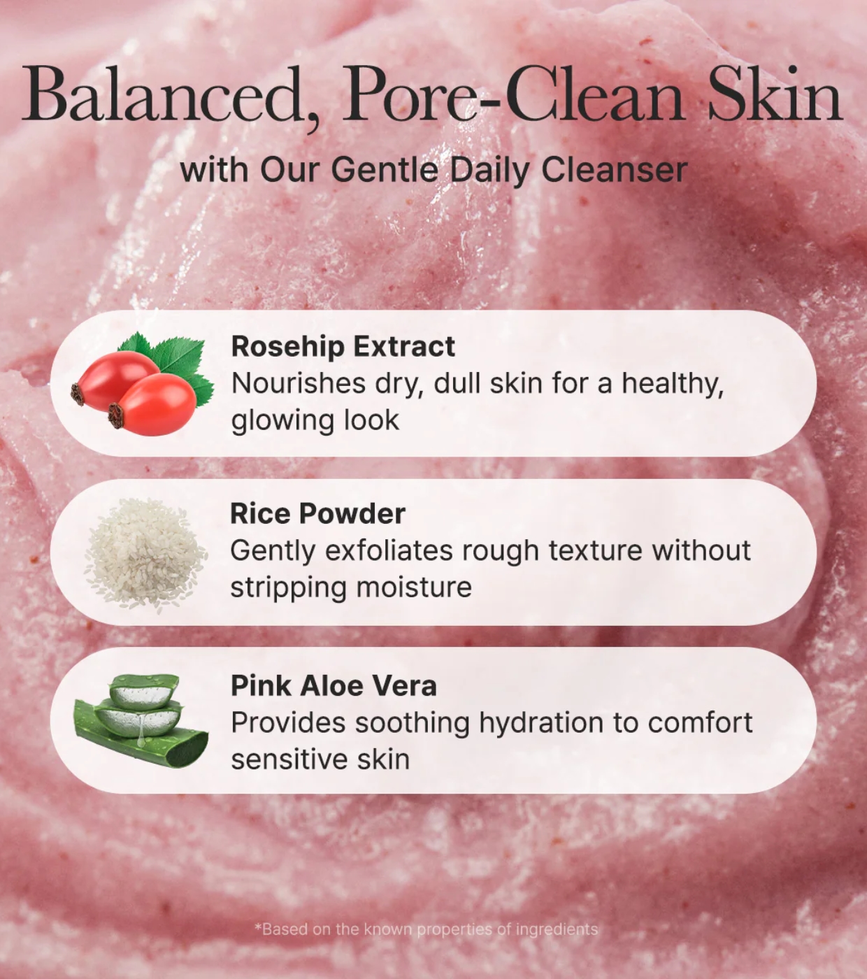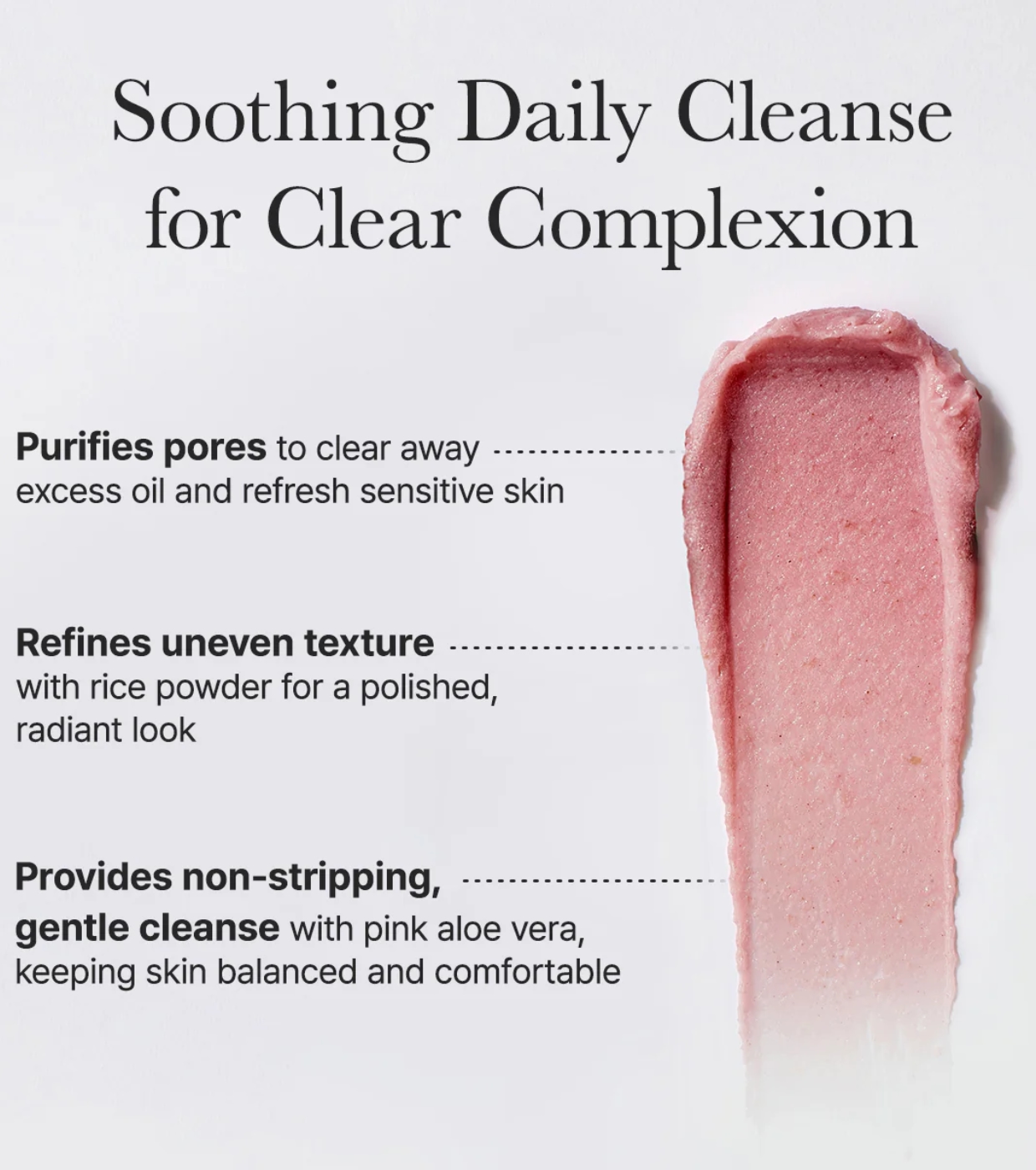 Su fórmula combina arroz fermentado, rosa mosqueta y aloe rosado, una sinergia de ingredientes que limpia eficazmente sin comprometer la barrera cutánea.