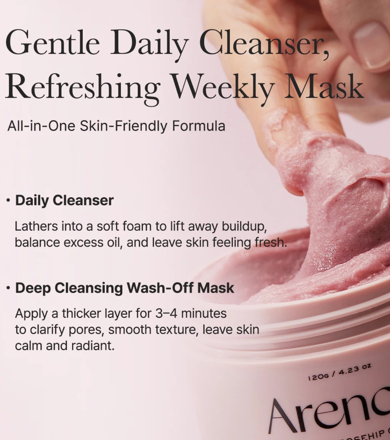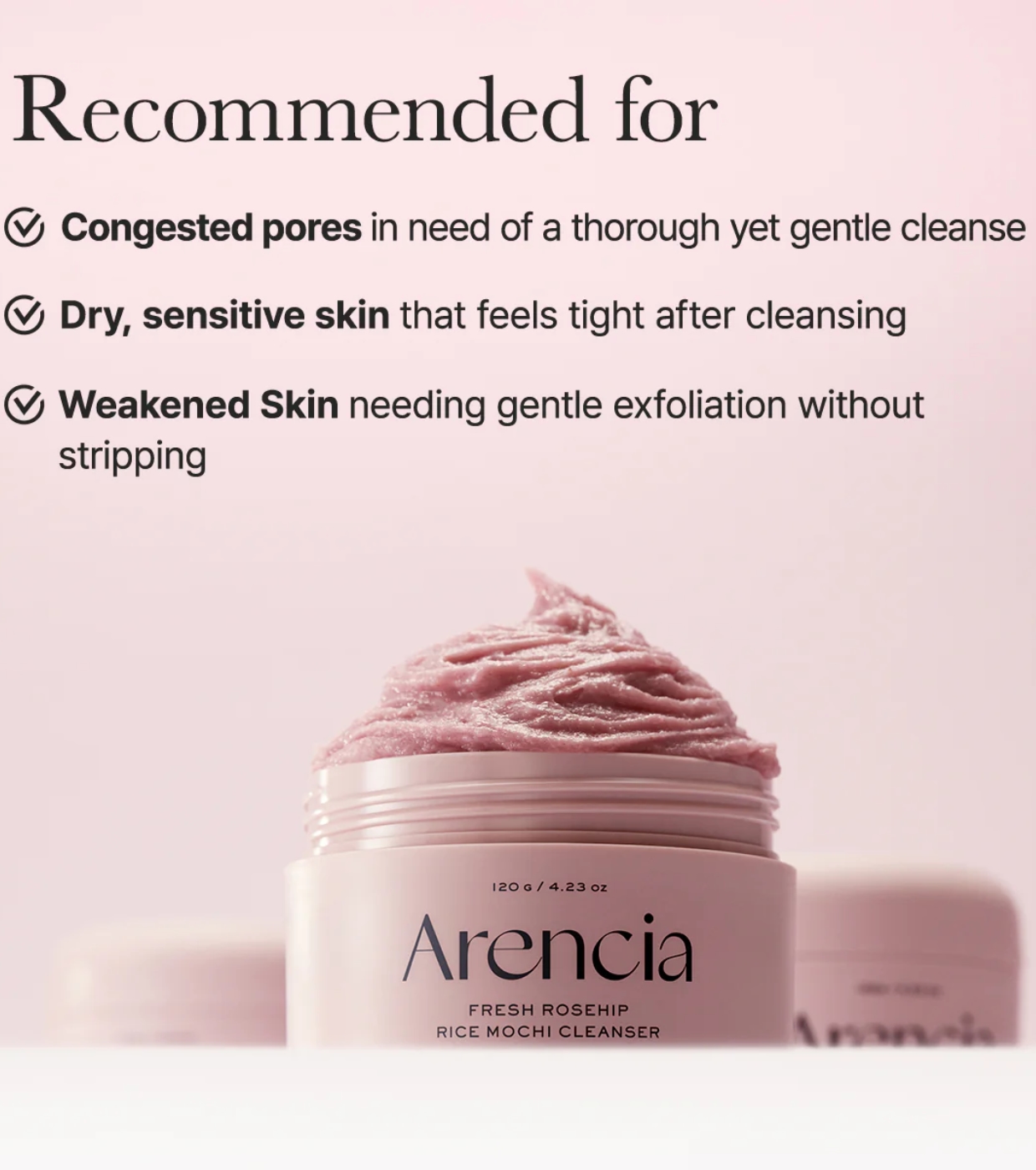 El Limpiador Fresh Rosehip Mochi de Arencia es un limpiador facial espumoso suave formulado para mejorar el tono, la textura y la hidratación de la piel, ayudando a calmar el enrojecimiento y a minimizar la apariencia de puntos blancos.