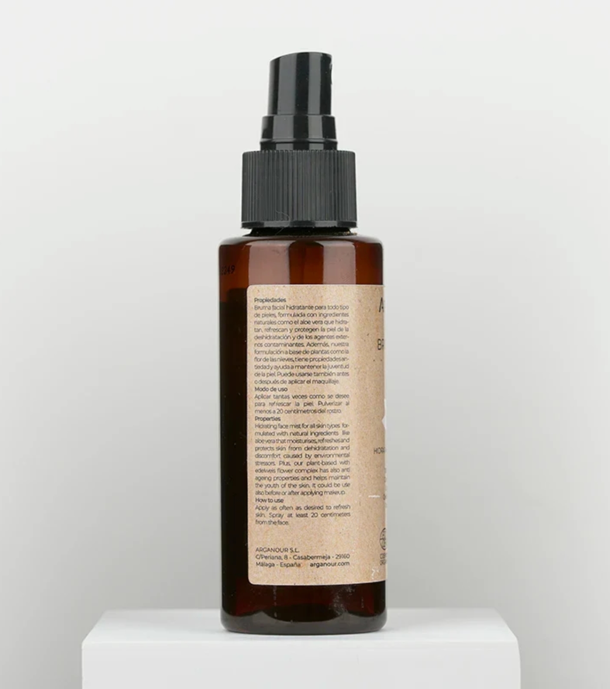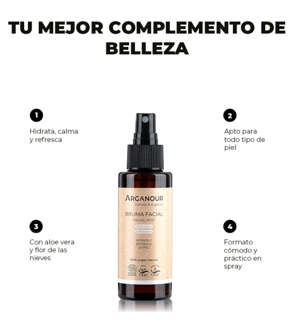 La bruma facial de Arganour, origen 100% natural, es muy práctica y cómoda de usar, pudiendo utilizarla a cualquier hora y en cualquier lugar.