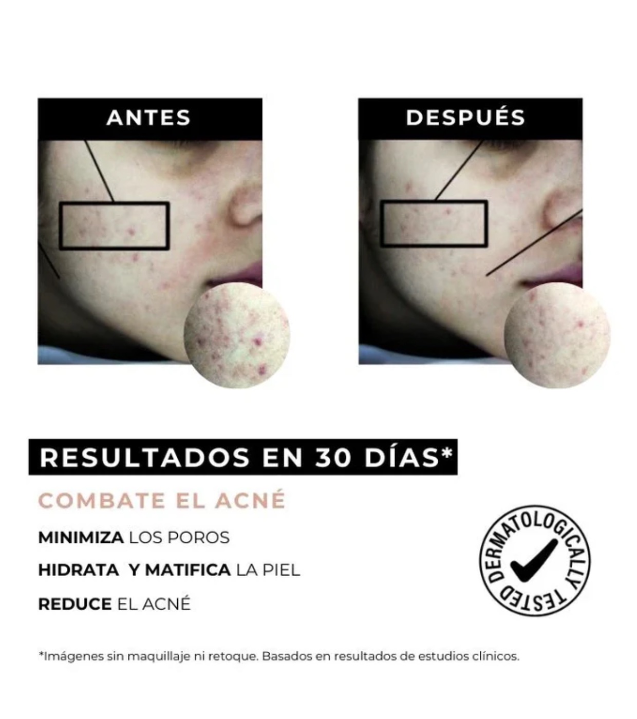 Reduce granos y espinillas, previene la aparición de nuevos brotes de acné, minimiza las imperfecciones (marcas o manchas del acné), y unifica el tono de la piel. Una crema hidratante de uso diario que te ayudará también a reducir y prevenir los brotes de acné.