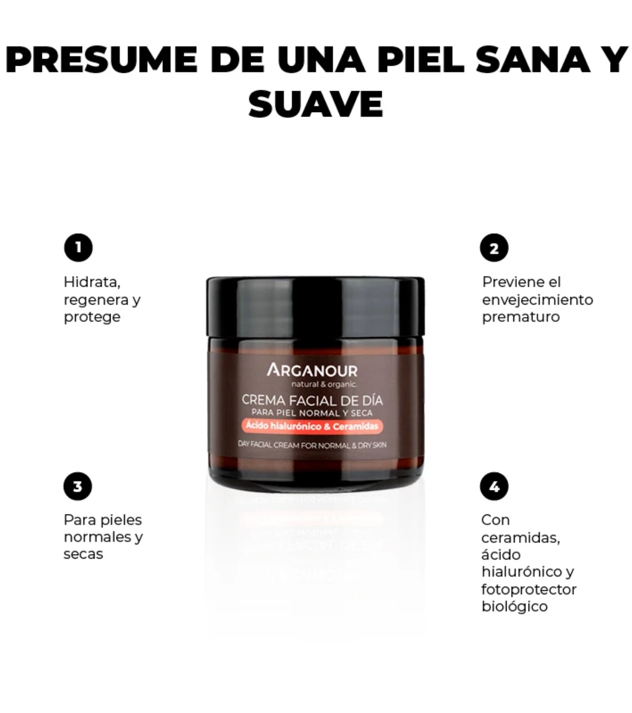 La crema facial antiedad pieles normales y secas de Arganour es una crema de día que hidrata y nutre profundamente la piel, mejorando visiblemente su elasticidad, firmeza y suavidad.