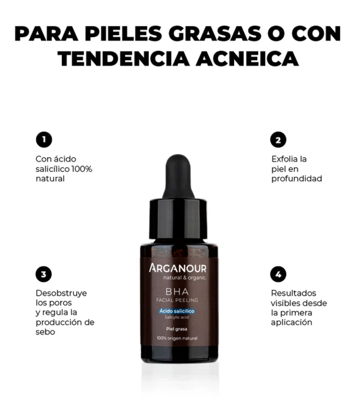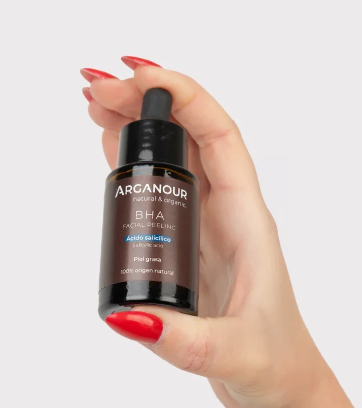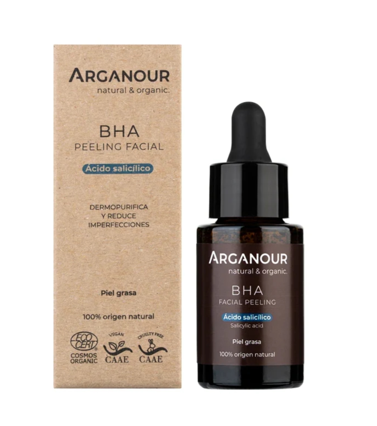Descubre el potente sérum BHA (con ácido salicílico natural) de Arganour que desobstruye los poros, descongestiona, elimina las células muertas, minimiza los poros y reduce las imperfecciones.