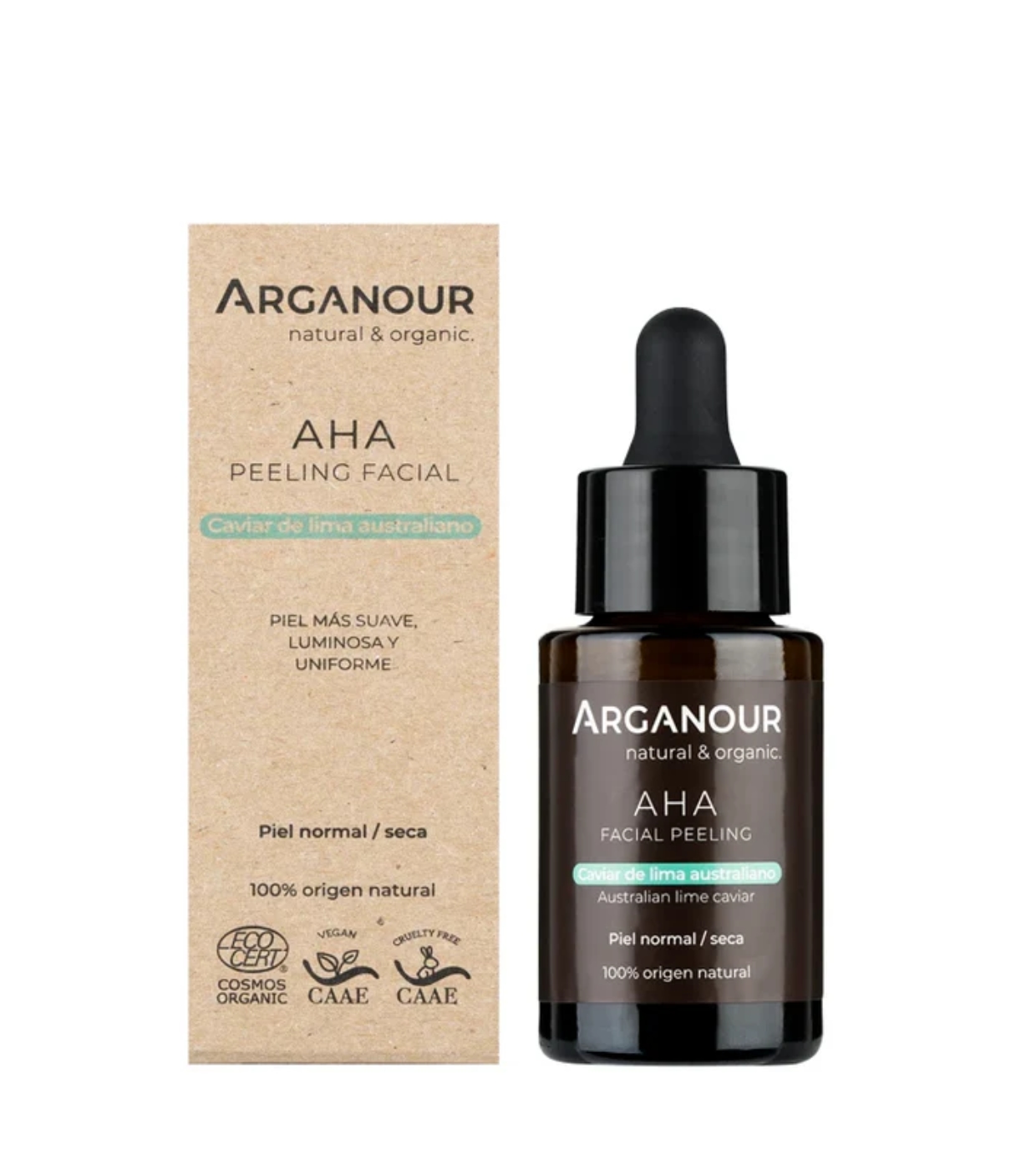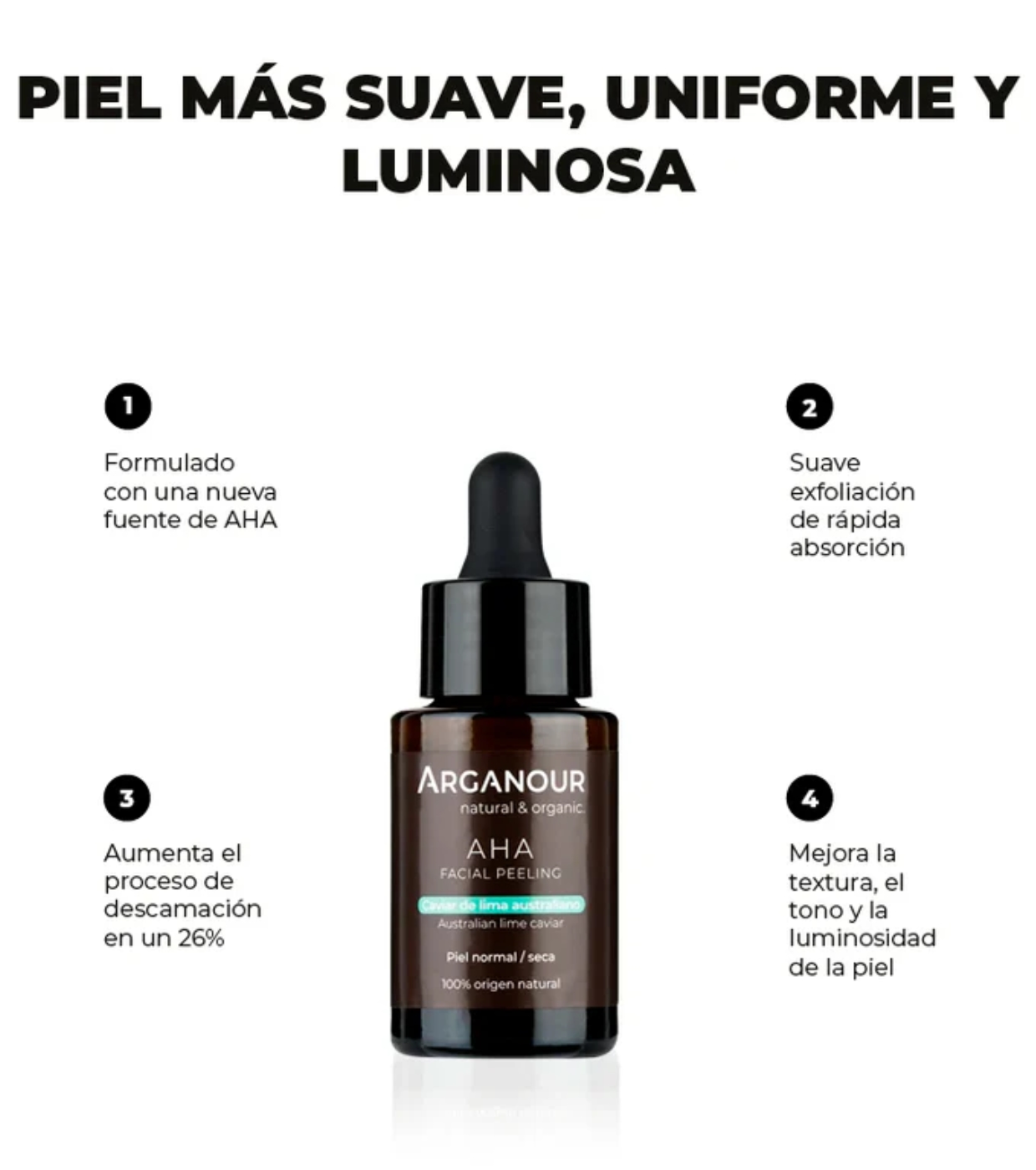 Piel suave, luminosa y unificada con el exfoliante AHA de Arganour.