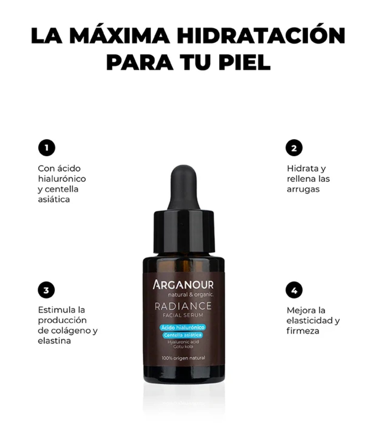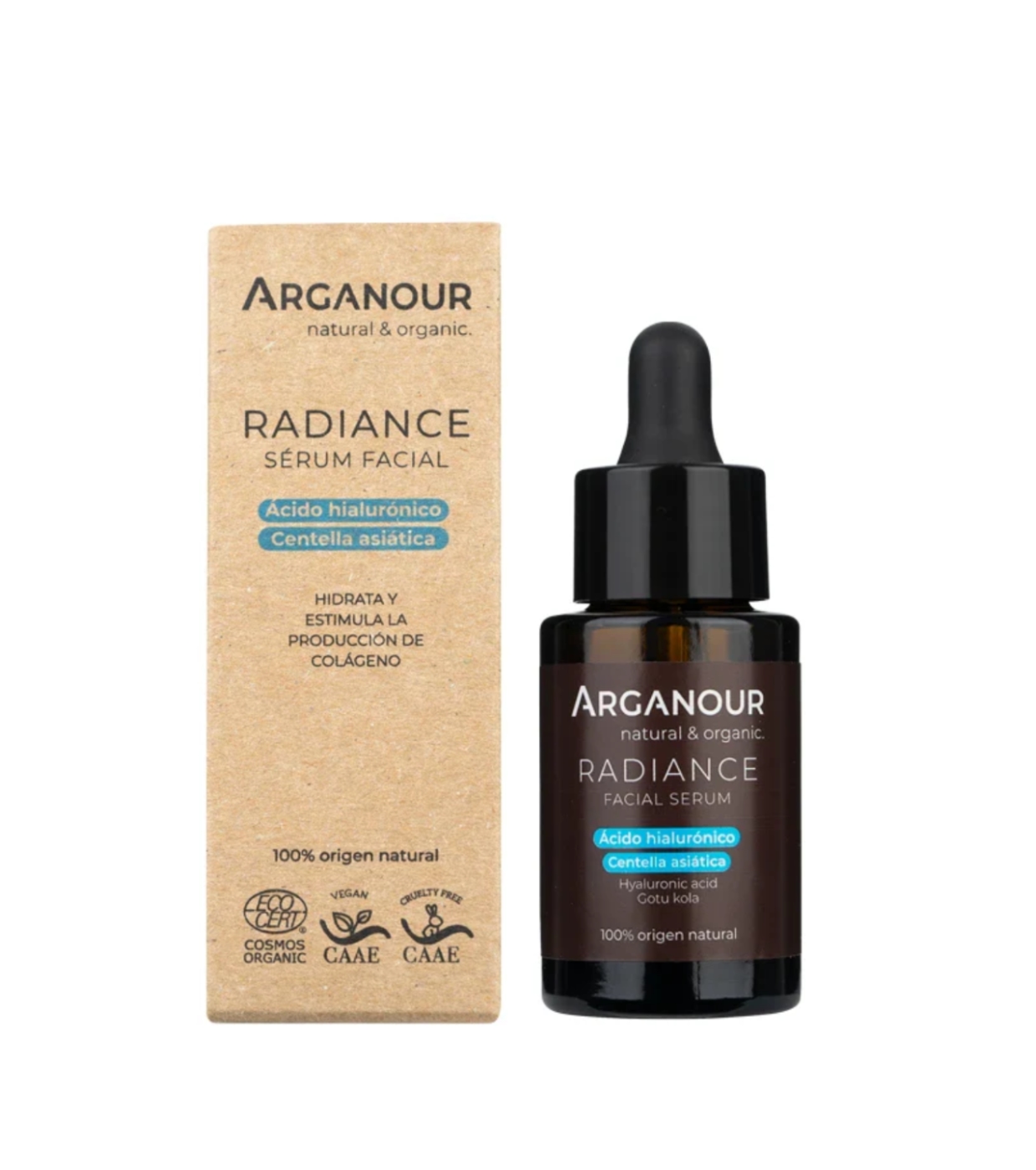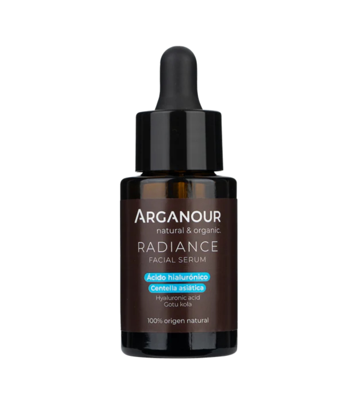 Luce un rostro más joven con el sérum facial de ácido hialurónico y centella asiática Radiance de Arganour de origen 100% natural.