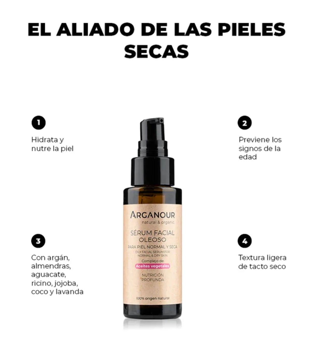 Este sérum facial de origen 100% natural está formulado a base de aceite de argán, almendras dulces, aguacate, ricino, jojoba, coco y lavanda.