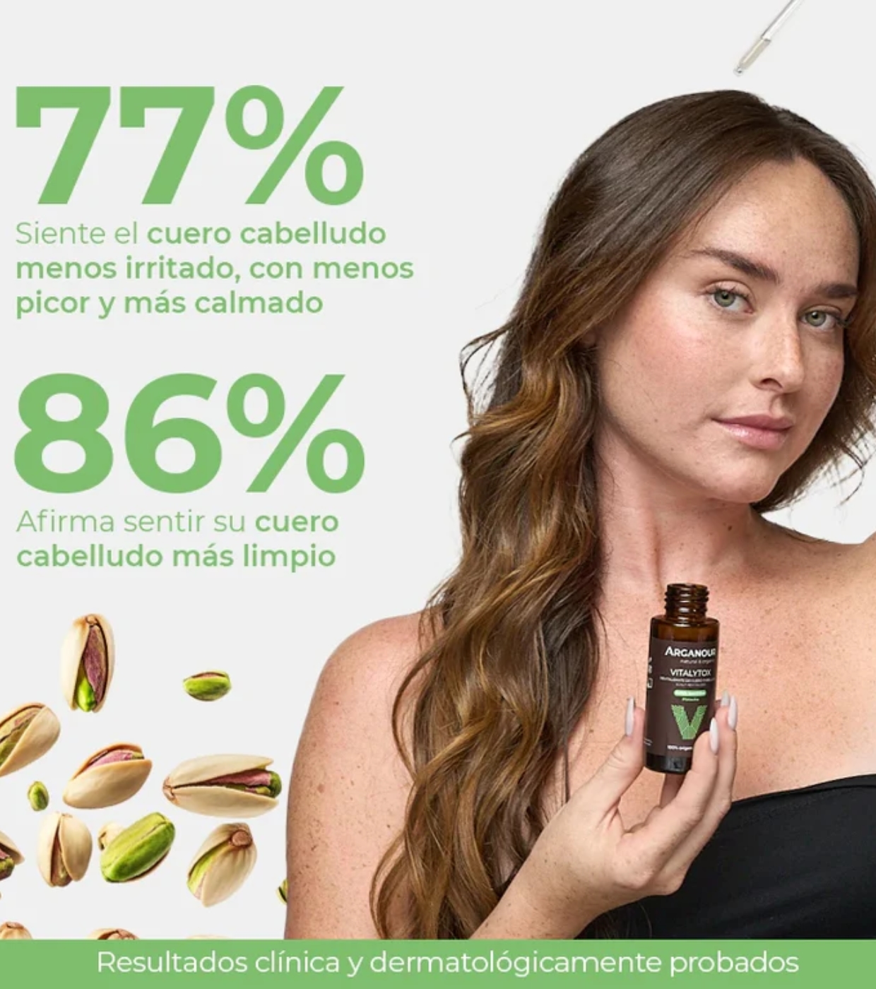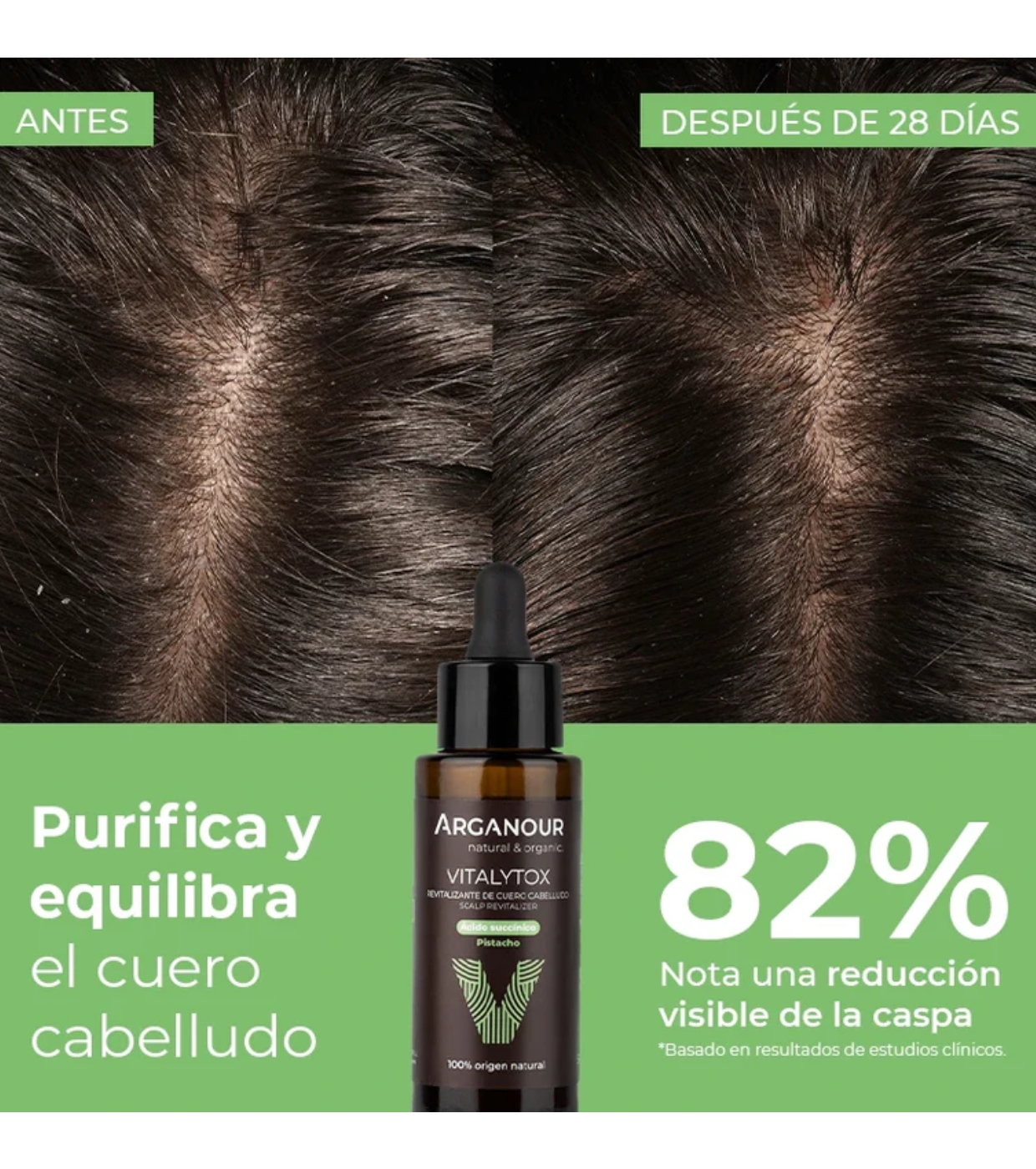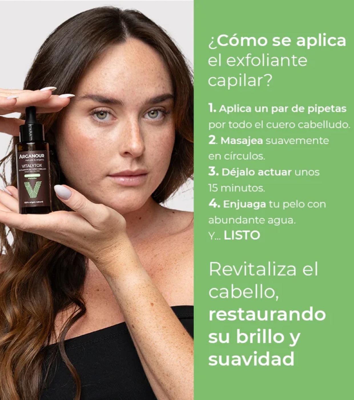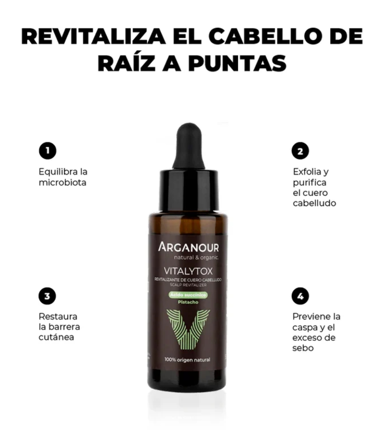 Descubre el secreto para un cuero cabelludo sano y equilibrado. Vitalytox de Arganour es un revitalizante capilar 100% natural que exfolia, purifica y reequilibra la microbiota, mejorando notablemente el aspecto y la textura del cabello desde la primera aplicación.
