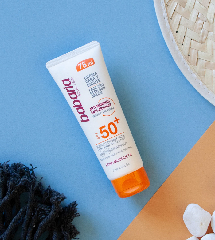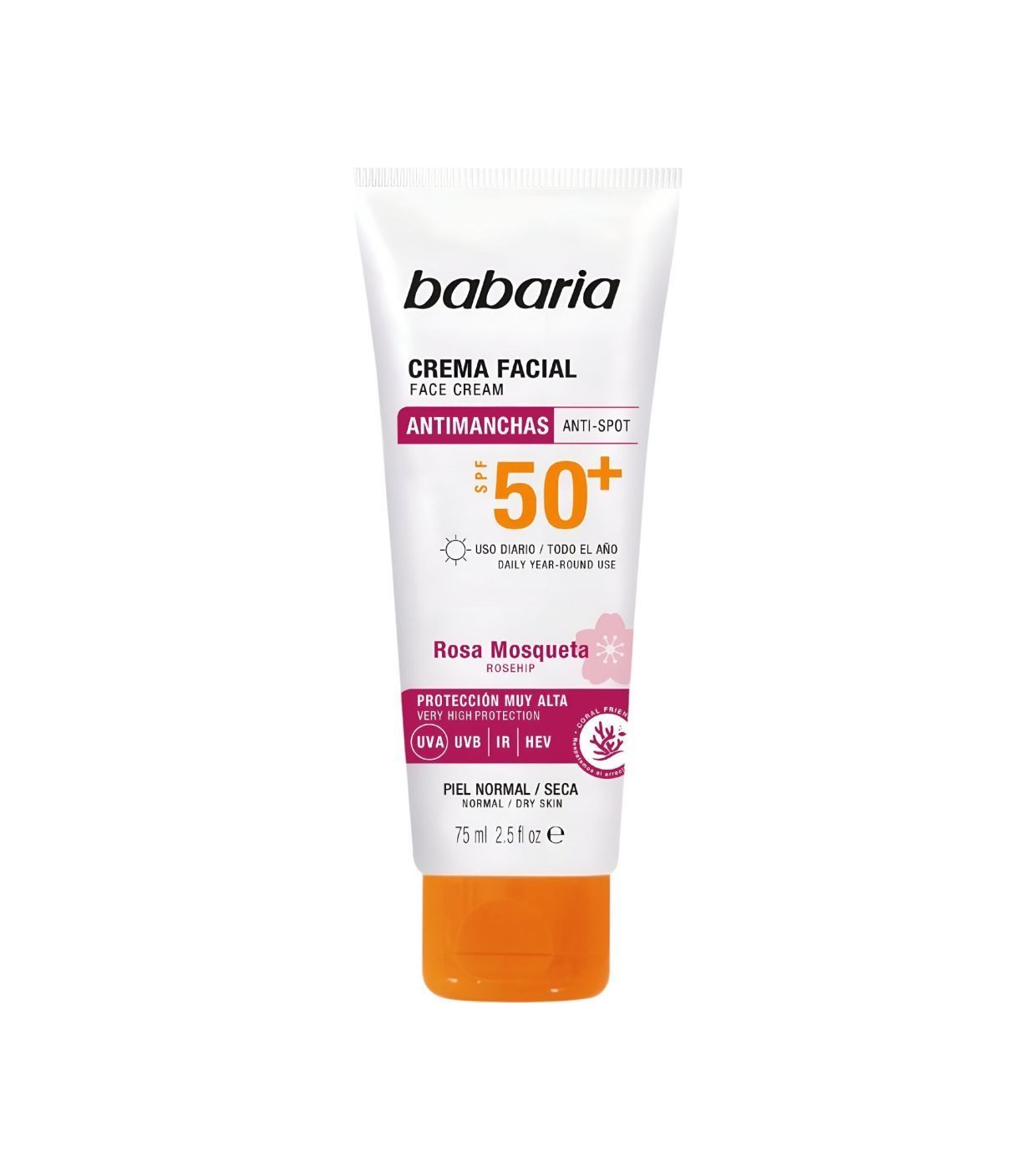 Crema facial de protección solar antimanchas SPF50+ rosa mosqueta de Babaria.