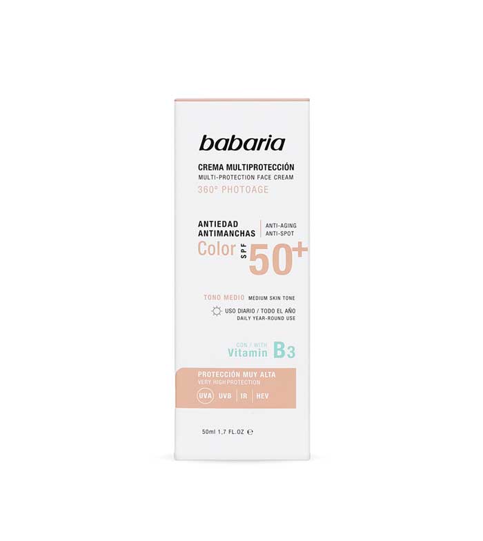 Crema facial multiprotección con color SPF50+ 360º Photoage de tono medio, de Babaria.