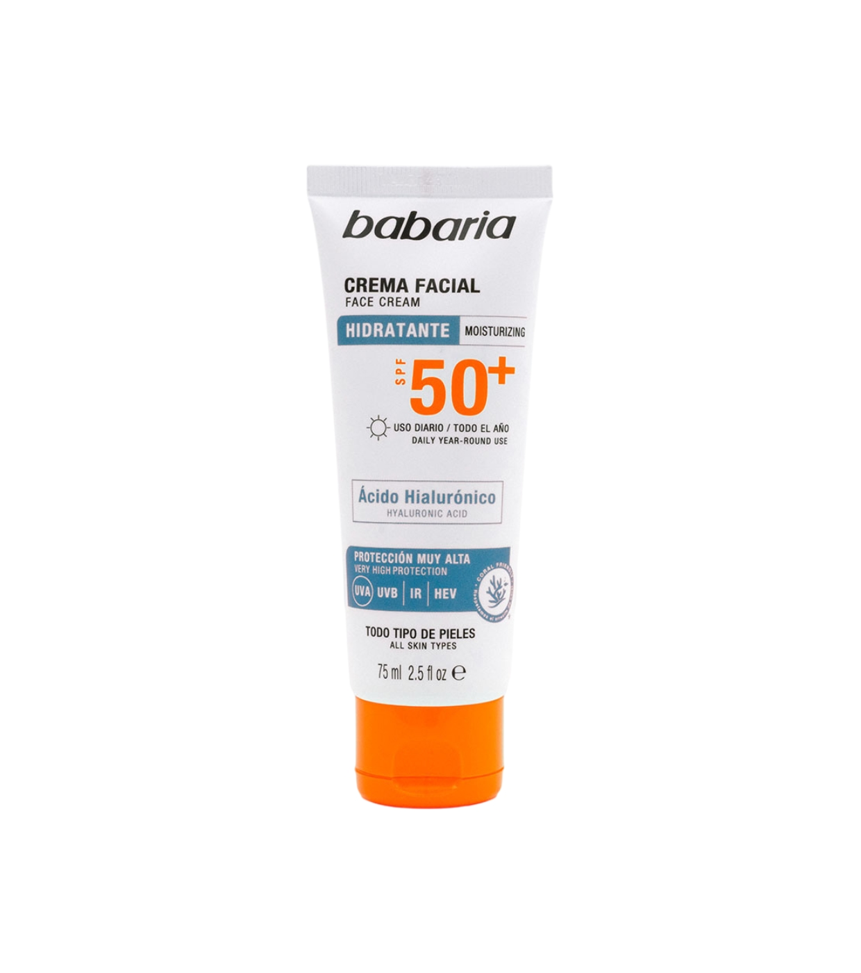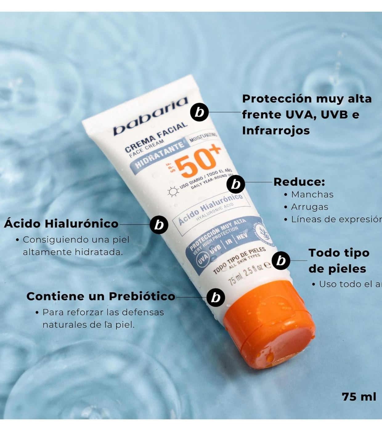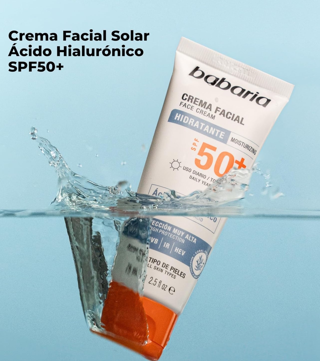 El protector solar facial hidratante SPF50+ de Babaria con Ácido Hialurónico ofrece una solución completa para el cuidado de la piel: protección global 360º, hidratación intensa y acción antiedad, en una fórmula ligera, eficaz y de uso diario durante todo el año.