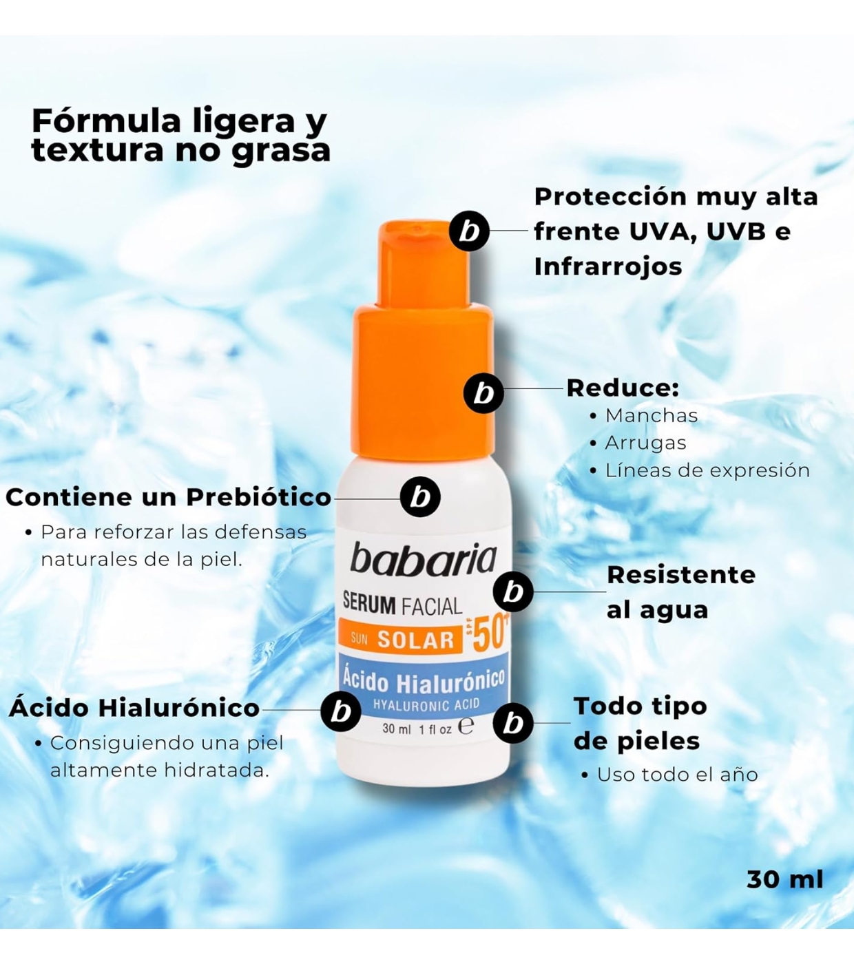 El sérum facial iluminador con SPF 50+ Ácido Hialurónico de Babaria combina tratamiento y protección en un solo gesto.