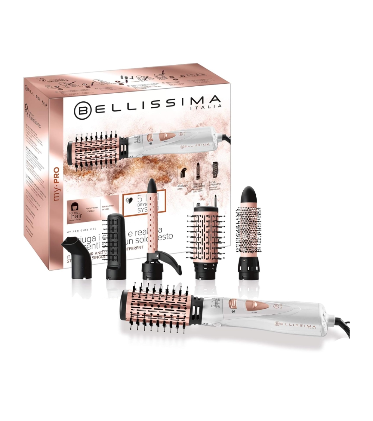 Bellissima Dry&Style System GH18 1100 es el cepillo de aire caliente 5 en 1 que seca y peina en un solo gesto, permitiéndote crear múltiples estilos: cabello liso y voluminoso, ondas suaves, puntas moldeadas o rizos definidos.