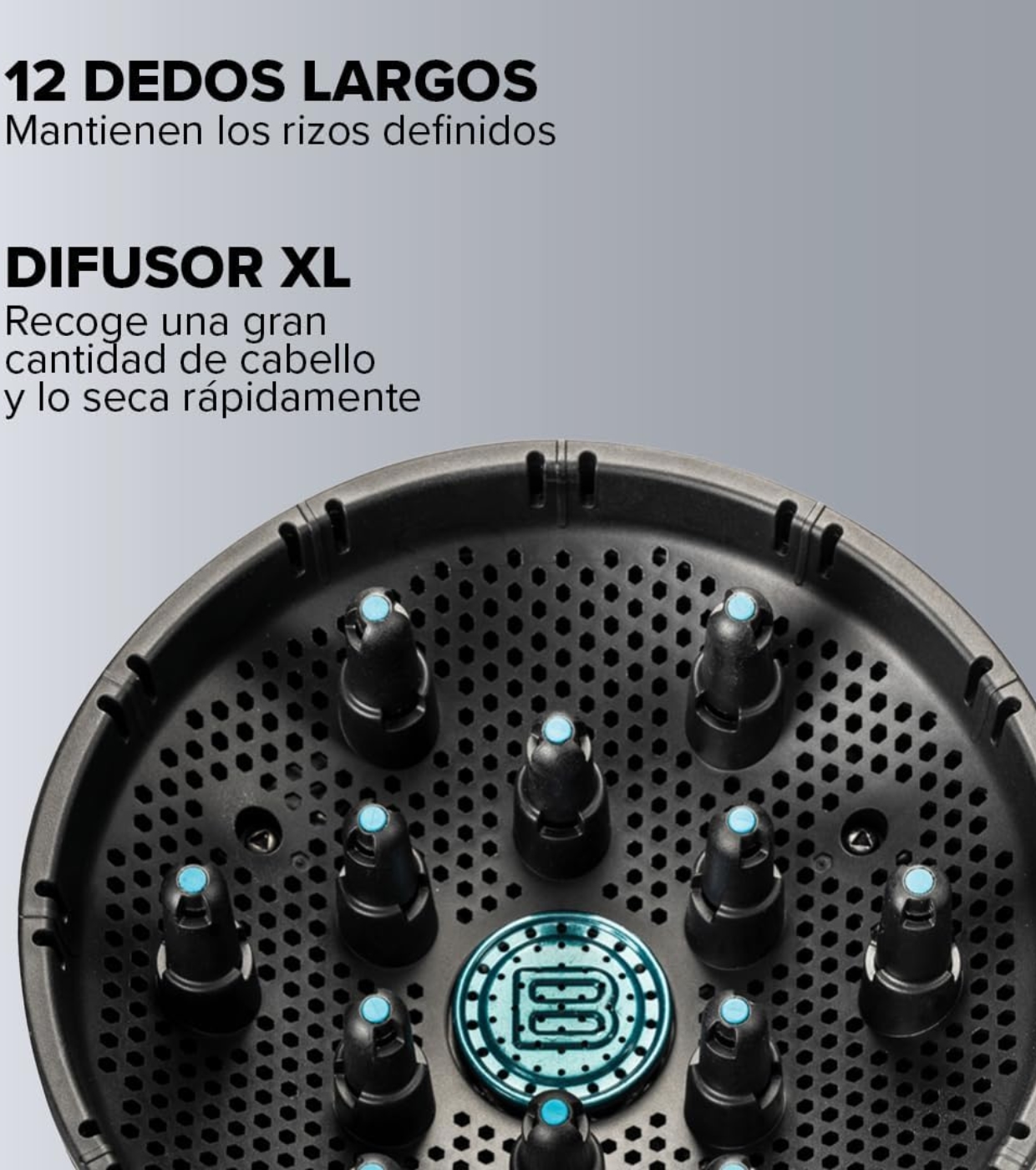 Con difusor XL, 12 púas largas y control digital del calor 50 veces por segundo, es perfecto incluso para rizos largos y delicados.