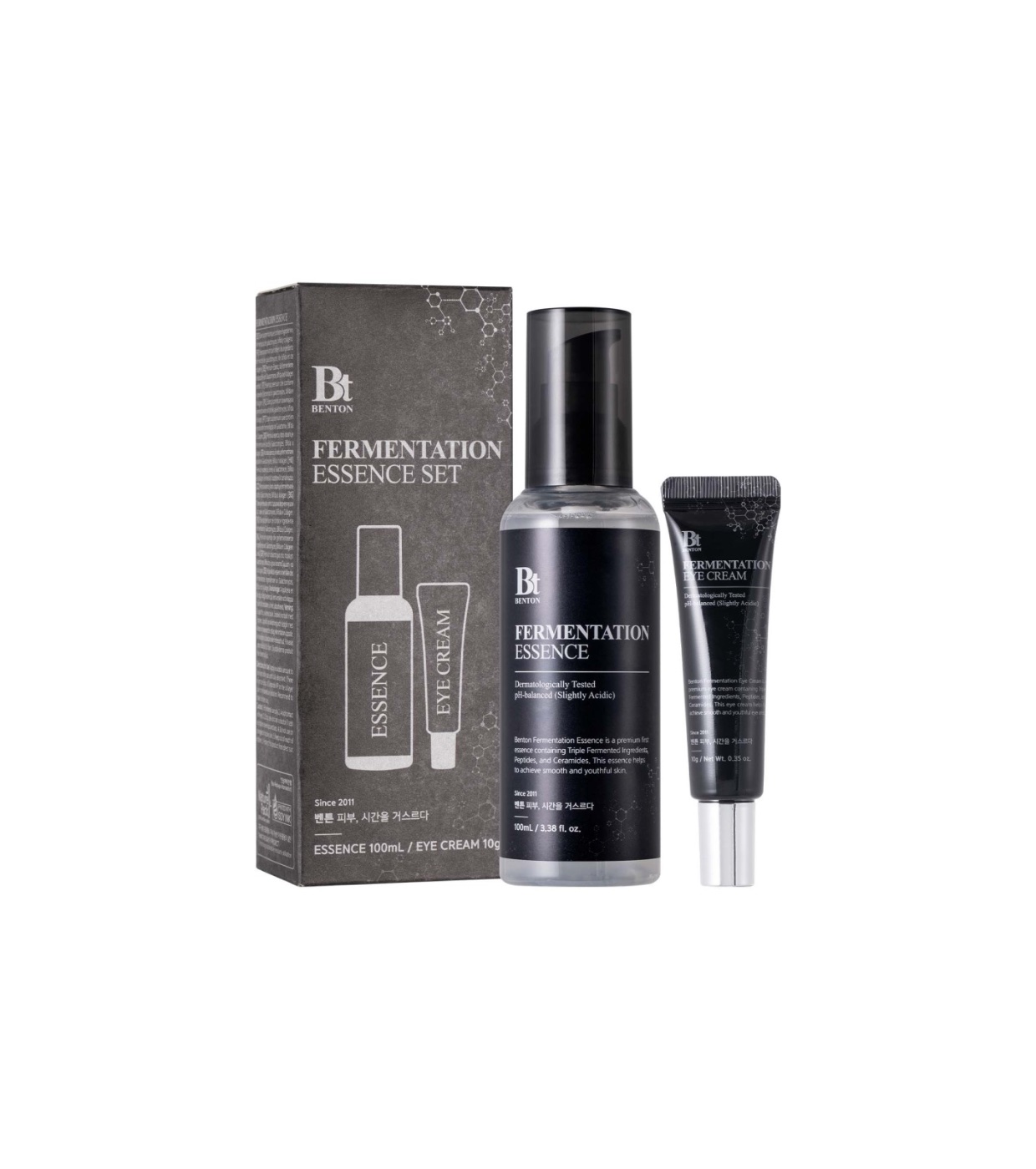 Kit de 2 productos Fermentation Essence Set de Benton, una colección de alta calidad formulada con ingredientes poderosos como fermento filtrado de Galactomyces, lisado de fermento Bifida, péptidos y ceramidas, diseñada para ofrecer resultados visibles en pieles maduras.