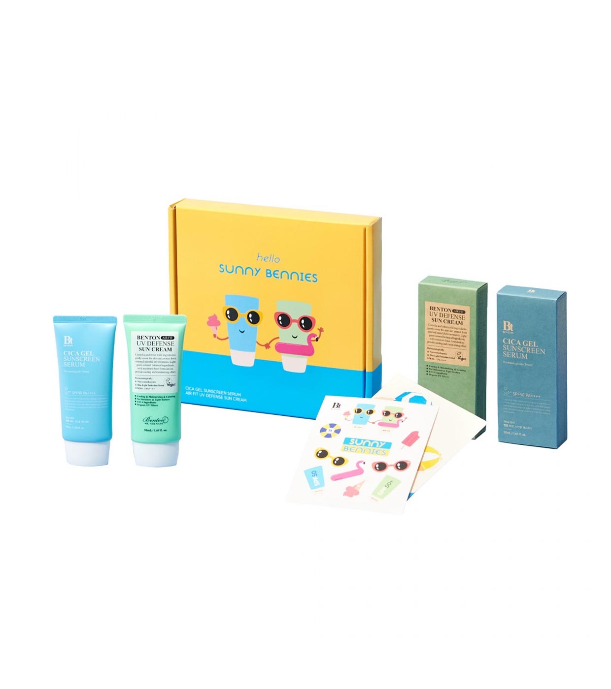 Dúo de solares de Benton: sus protectores solares superventas, tan efectivos como cómodos en la piel, en un pack monísimo con pegatinas ideal para regalar o autorregalar.