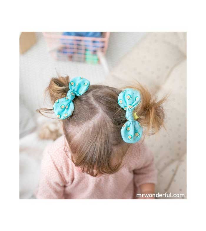 Dos coleteros elásticos en azul clarito estampados con divertidos aguacates sonrientes, ideal para dar color a los recogidos o trenzas de los más pequeños.