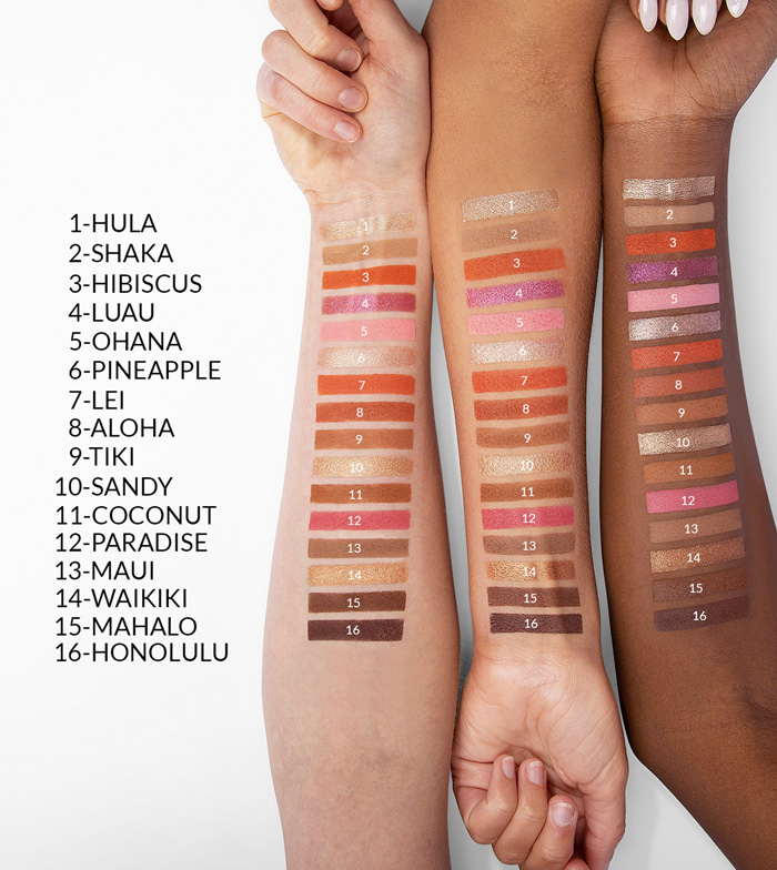 Hana, Haleakal?, K?lauea, Mauna Kea, Lanai, O‘Ahu, Koko Head, Molokini, Lanikai, Maui, Waikiki, Mahalo, Honolulu: Mica, Talc, Nylon-12, Boron Nitride, Diisostearyl Malate, Dimethicone, Pentaerythrityl Tetraisostearate, Magnesium Stearate, Tocopheryl Acetate, Triethoxycaprylylsilane, Aluminum Hydroxide, Phenoxyethanol. May Contain/Peut Contenir [+/-: Titanium Dioxide (CI 77891), Iron Oxides (CI 77491, CI 77492, CI 77499), Bismuth Oxychloride (CI 77163), FD&C Red 40 Lake (CI 16035), Ultramarines (CI 77007), FD&C Yellow 5 Lake (CI 19140:1)].