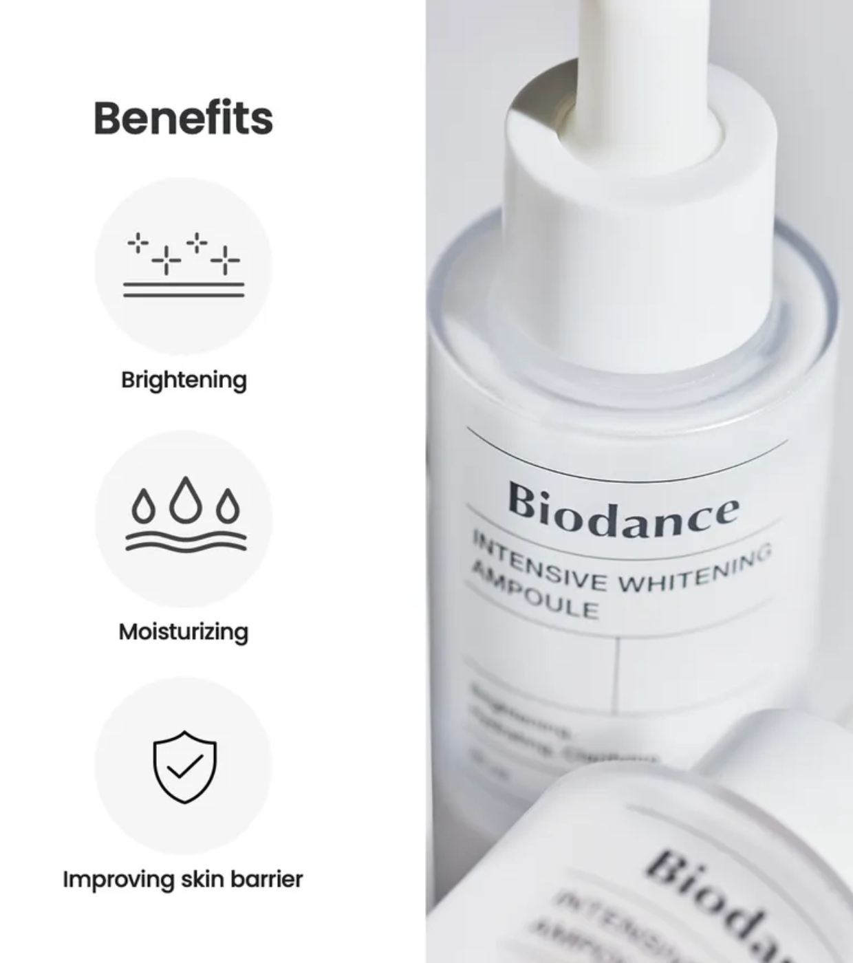 Ilumina, unifica e hidrata tu piel con la ampolla Intensive Whitening de Biodance, un sérum facial de alto rendimiento diseñado para tratar manchas oscuras, pigmentación desigual y pérdida de luminosidad.