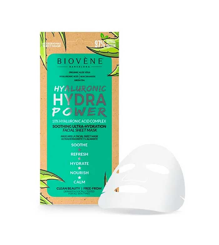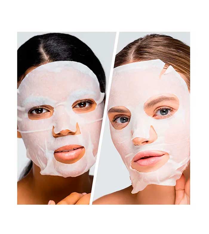 Esta mascarilla hidratante contiene ácido hialurónico intensamente hidratante y aloe vera orgánica que suaviza, calma e hidrata la piel al instante.