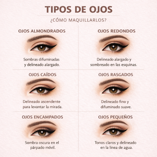 Antes de hablar de técnicas, es importante saber qué tipo de ojos tienes. Para identificarlos, colócate frente al espejo con el rostro relajado y fíjate en: