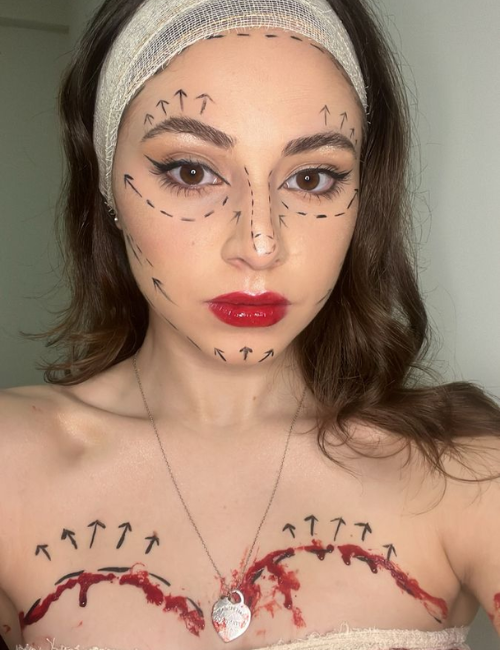 Pro Tip: Puedes llevar vendas falsas en la cabeza o esparadrapos en el rostro para reforzar el efecto de recién “operada”.