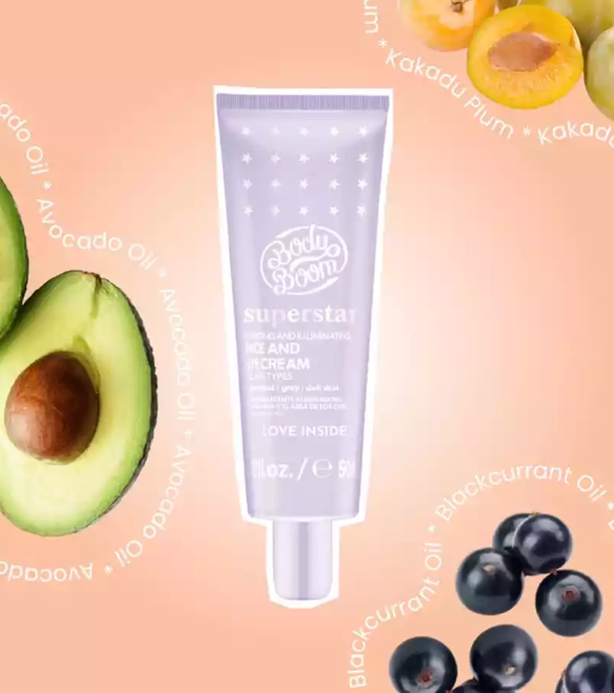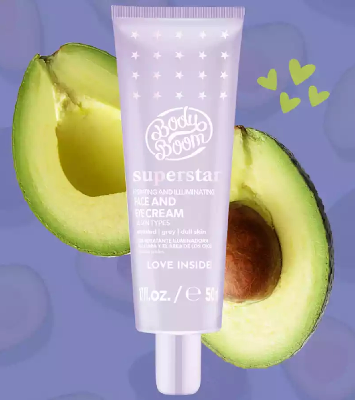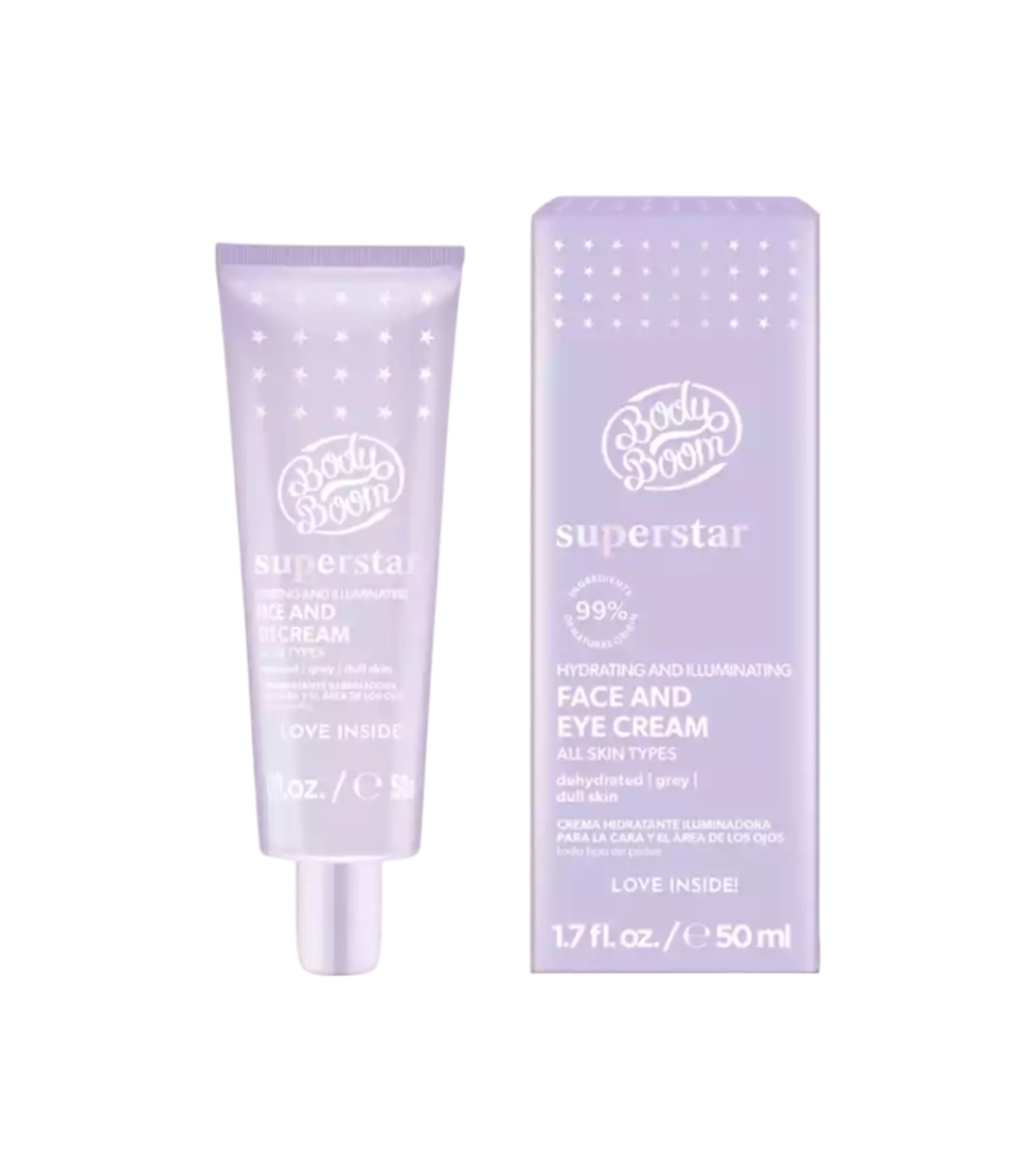 Energiza tu piel con la Superstar Face & Eye Cream de BodyBoom, una crema 2 en 1 que hidrata, ilumina y aporta frescura tanto al rostro como al contorno de ojos.